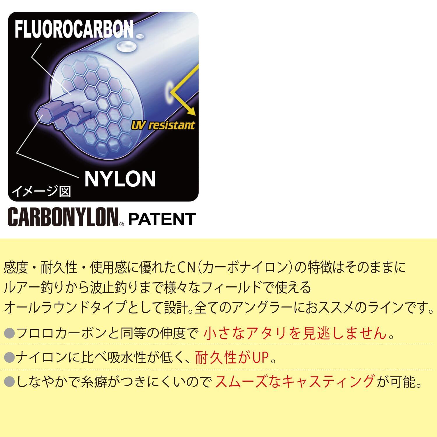 【CARBONYLON PATENT】:感度・耐久性・使用感に優れたCN(カーボナイロン)の特徴はそのままに、ルアー釣りから波止釣りまで様々なフィールドで使えるオールラウンドタイプとして設計。<br>全てのアングラーにおススメのラインです。