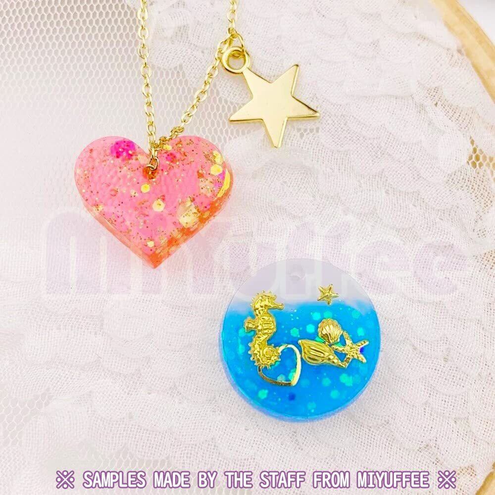 4個のシリコンモールドでパーツを合計26種も作れ、一部は通し穴付きで、ネックレスやピアスのペンダント、ストラップなどのオリジナルの作品を製作することができます。ジュエリー・宝石・丸・蝶々・ハート・フレームなど様々なアクセサリーパーツに最適です。