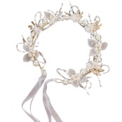 【商品セット】ヘアドレスカチューシャ本体、装着用リボン2本。長さ約35cm、重量47g、リボンでサイズを拡大できる。