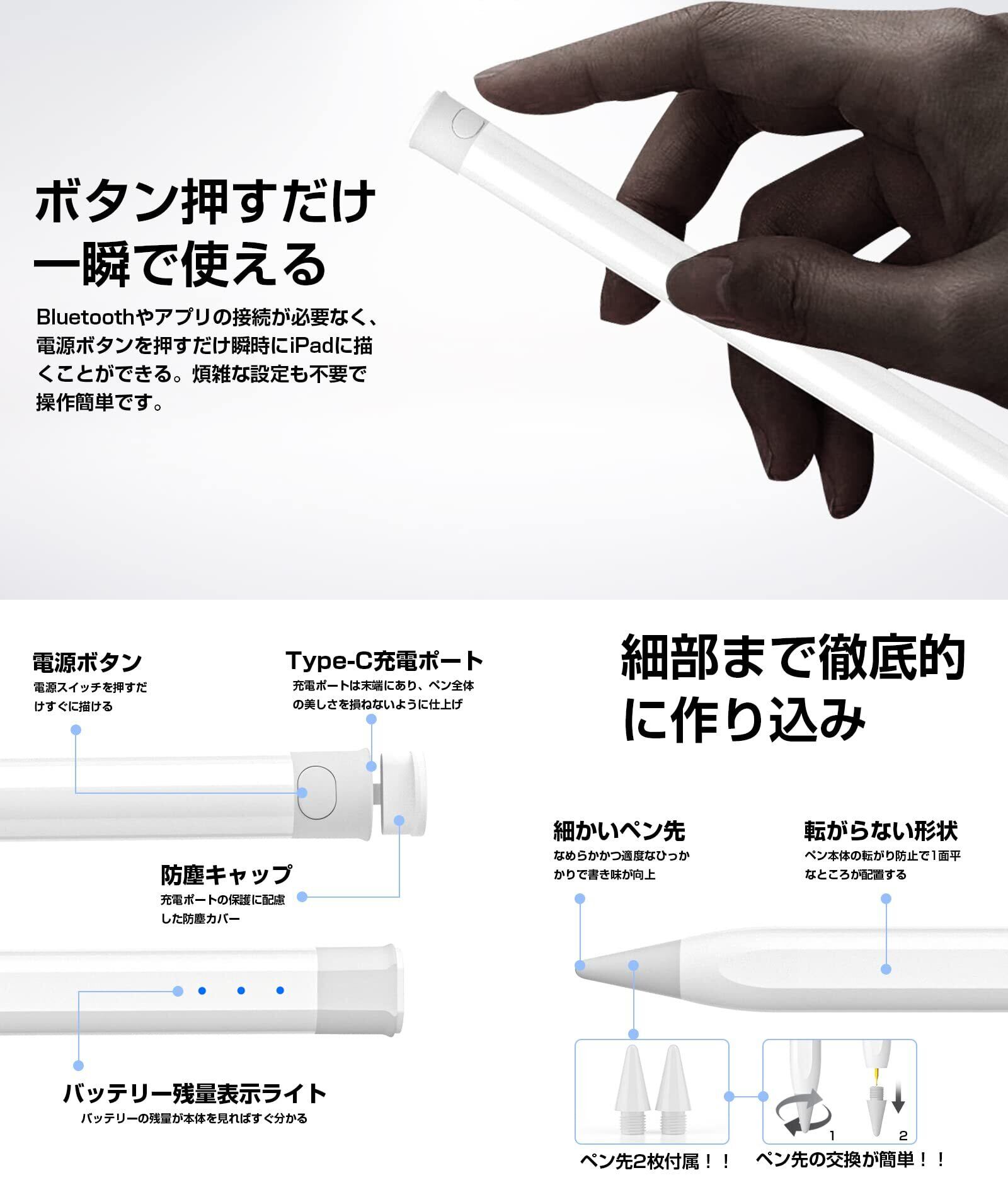 【Type-c充電式&長時間の連続使用】充電ポートに付属のType-cケーブルを接続して充電することができます。1時間のフル充電で、最大約11時間の連続使用が可能!さらに、5分間の充電で約1時間使用できる高速充電機能付きです。また、5分間操作しないと自動的に電源が切れる機能を搭載し、無駄な電力消費を抑えています。【対応機種】:iPad(第6/7/8/9/10世代)、iPad mini (第5/6/7世代)、iPad Air(第3/4/5世代)、iPad Pro 11インチ、iPad Pro 12.9インチ(第3/4/5/6世代)、iPad Air 11インチ/13インチ (M2)、iPad Pro 11インチ/13インチ (M4)