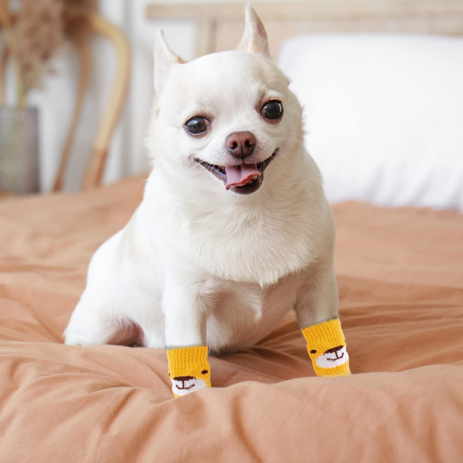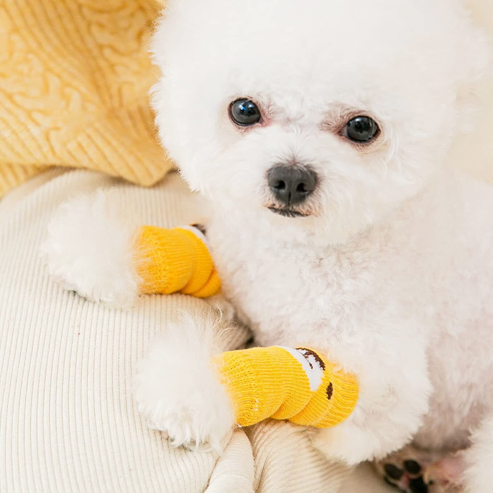 【パッケージ内容】黄色いクマさん柄のペット用レッグウォーマーを4枚お届けします。