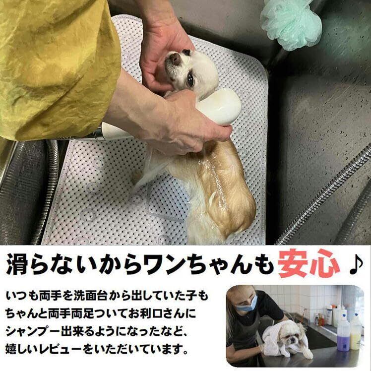 42個のタコの吸盤を真似た吸盤付きマットが滑りを防止!ケガを防ぎます。 密着力が強くカーブの洗面台で使っていてもしっかり安定&滑りにくい。ペットがリラックスしてシャンプーできるようになります。