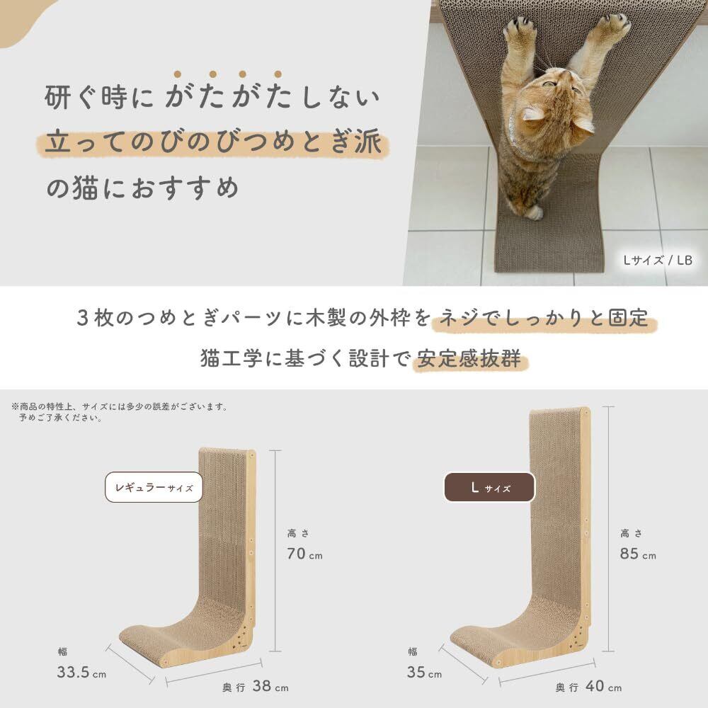 【選べる2サイズ&2カラー】 猫の体格やつめとぎスタイルに合わせてレギュラー・Lサイズの2サイズを揃えています。レギュラーは高さ70cm、Lサイズは高さ85cm。大きめの猫や垂直伸びスタイルが好きな猫にはLサイズがおすすめです。 カラーはライトブラウン・ダークブラウンの2色から、おうちのインテリアや猫の経路に合わせてお選びいただけます。 ウッドプレミアムは外枠が木製(MDF板)でサイドのパネルがなく、スタイリッシュな外観に猫壱のロゴマークを入れたシンプル可愛い木目調デザイン。固定ネジのカラーを外枠と同色にし、全体のデザインによく馴染むよう配慮しいています。