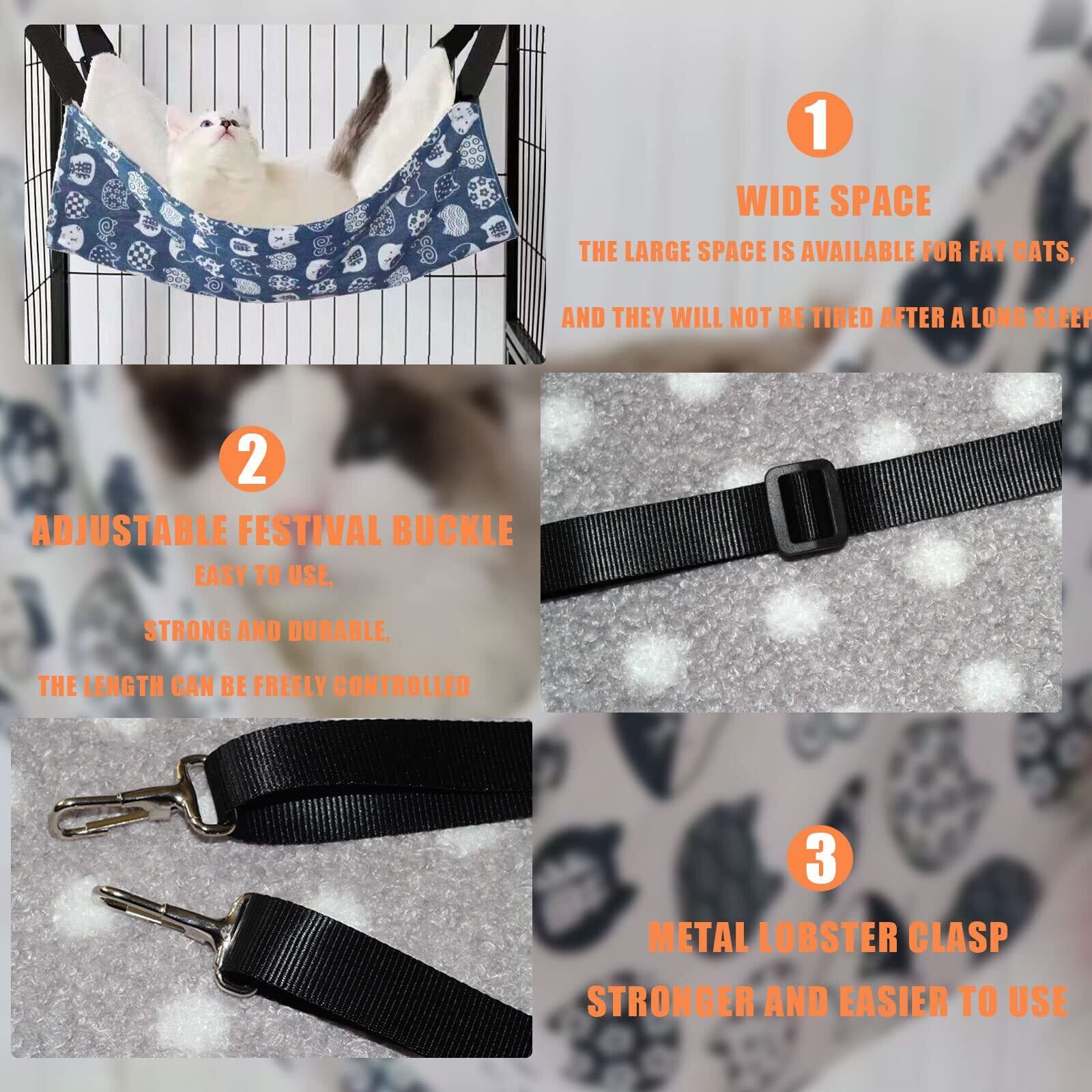 材質:綿、ポリエステル、合金 サイズ:60cm*50cm キャンバス生地と起毛生地で作られた猫用ハンモックです。リバーシブルのハンモックは夏でも冬でもご利用いただけます。キャンバス生地は通気性が良いので夏に適しています。起毛素材は柔らかくて保温性に優れるので、寒い時期でも猫が快適に過ごせます。 金具が付いているのでケージに取り付けやすい。柄が可愛くてケージに設置すると、ケージ内の雰囲気が変わります。 大きめなサイズで安定感があります。猫がハンモックに乗って、遊んだり寝たりします。