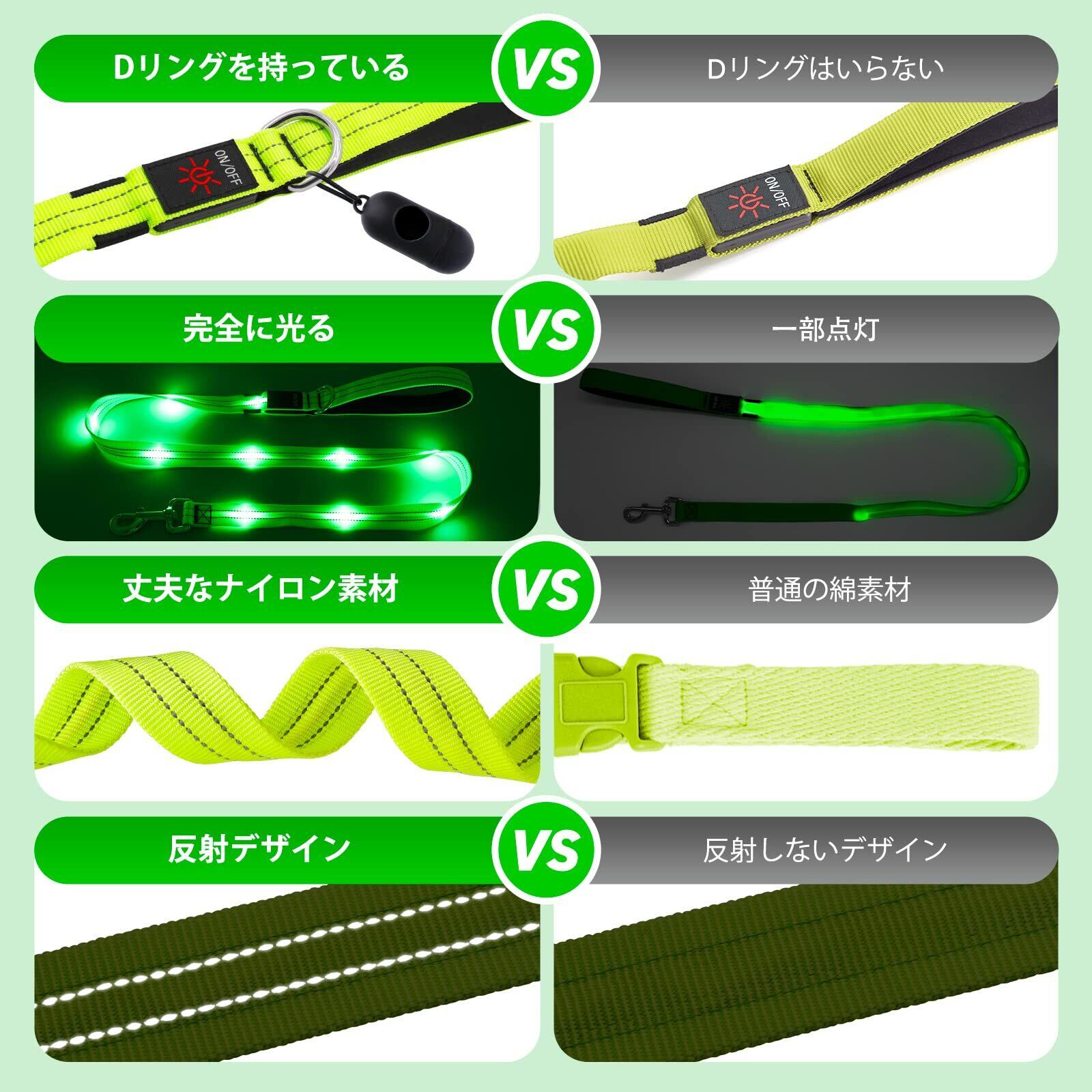 優れた作りと防水反射 - 最新の防水ナイロン素材 (水泳ではありません)、非常に耐久性があり、丈夫で噛むことができ、洗いやすく、汚れにくいです。 事故を避けるために暗闇の中であなたとあなたの犬が見えるようにするために、犬用のライトアップリードの表面に2つの反射ストリップが縫い付けられています.