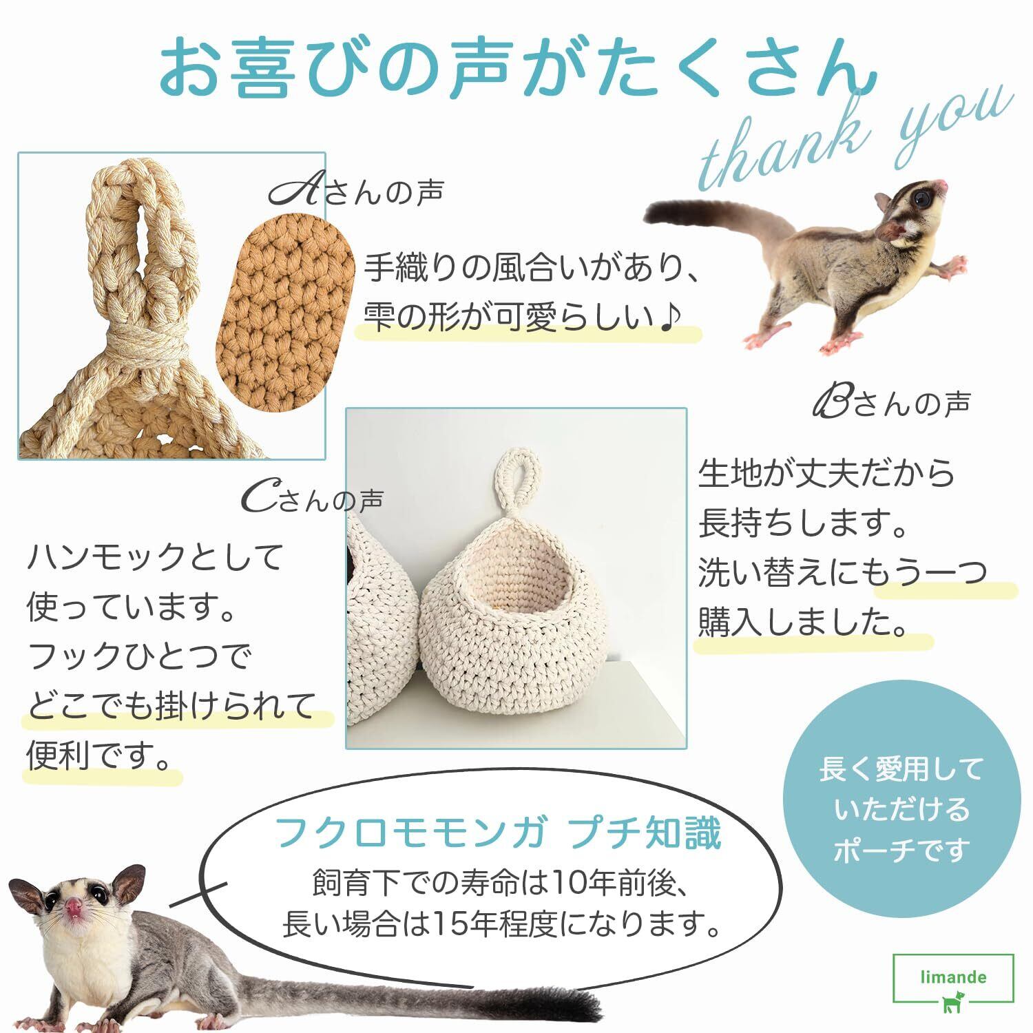 limande フクロモモンガ ポーチ モモンガポーチ 手織り 雫型 吊り下げフック付き 小動物 ハウス(カーキ色)
