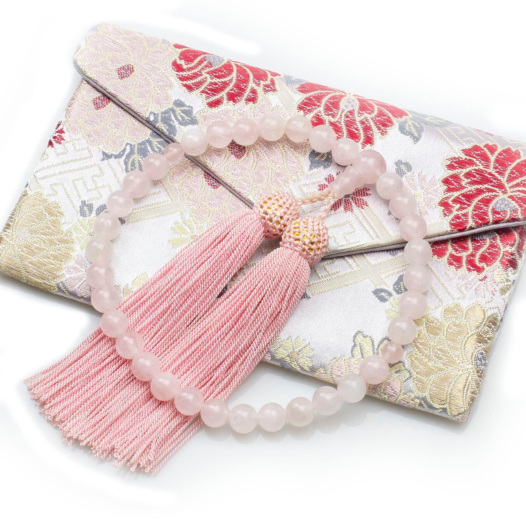 数珠 女性用 紅水晶(ローズクォーツ) 8mm玉 正絹梵天房 マグネット式数珠袋付き すべての宗派で使える 手作り 念珠