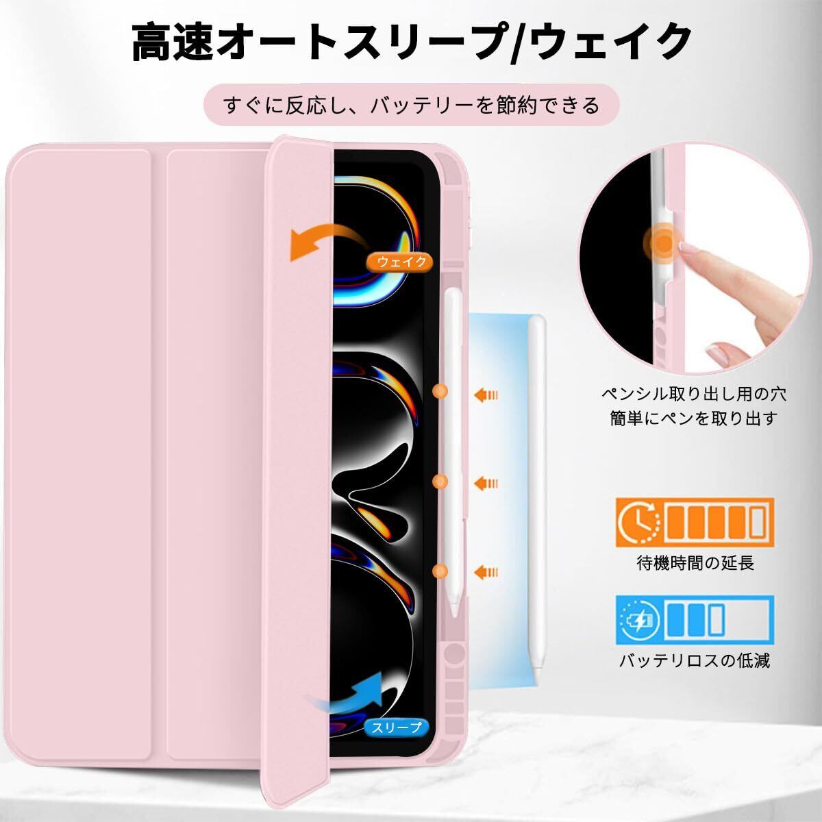 iPad Pro 13インチ M4 (2024) ケース 三つ折スタンド ペン収納 オートスリープ/ウェイク機能対応 耐衝撃 薄型 軽量 傷防止 全面保護 着脱簡単 - ピンク