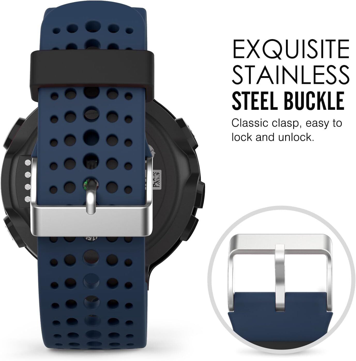 取り付け簡単: ツール必要なく、ピンでウォッチ本体と合わせて取り付けすれば、簡単に交換できます;安定性が高めたステンレス製の留めバックルとダブル遊革の仕様よりスポーツの最中でも腕にしっかりと固定して装着できます;対応腕幅は5.11インチ(130mm)~8.46インチ(215mm)です