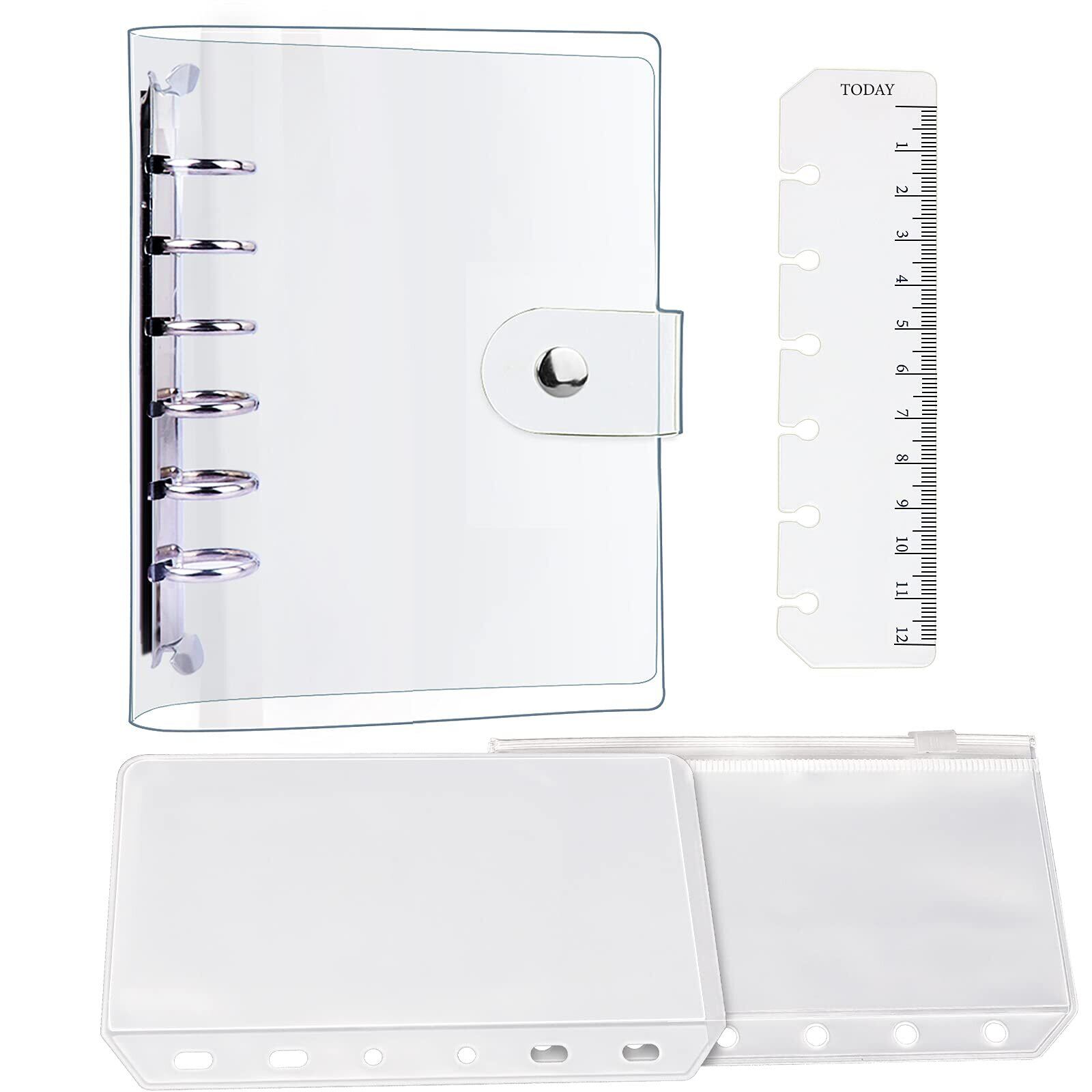 システム手帳 a7透明バインダー Leobro ミニ6穴手帳 ポケットサイズ PVCクリア素材 柔らかい ボダン付き クリアポケット 2枚付き 定規付き ノート メモ帳
