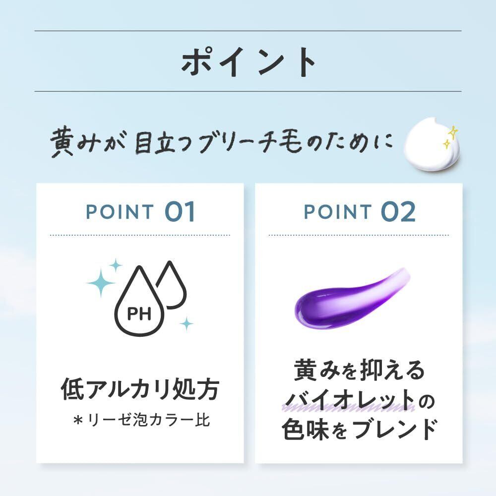 黄みが目立つブリーチ毛のために 繊細な色味を長く楽しめるカラー 〇黄みを抑えるバイオレットの色味をブレンド 〇やわらかな色が徐々に抜けて 髪色変化も楽しい 〇髪がからまりにくい泡タイプ。もみこむだけで簡単 〇低アルカリ処方* *リーゼ泡カラー比 なめらかさが持続するトリートメントつき 髪の内部まで補修 なめらかな指通り続く 枝毛・切れ毛を防ぐ