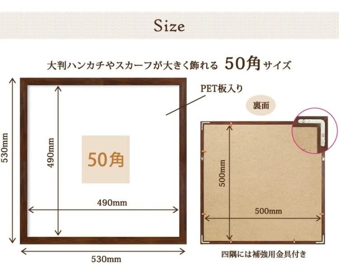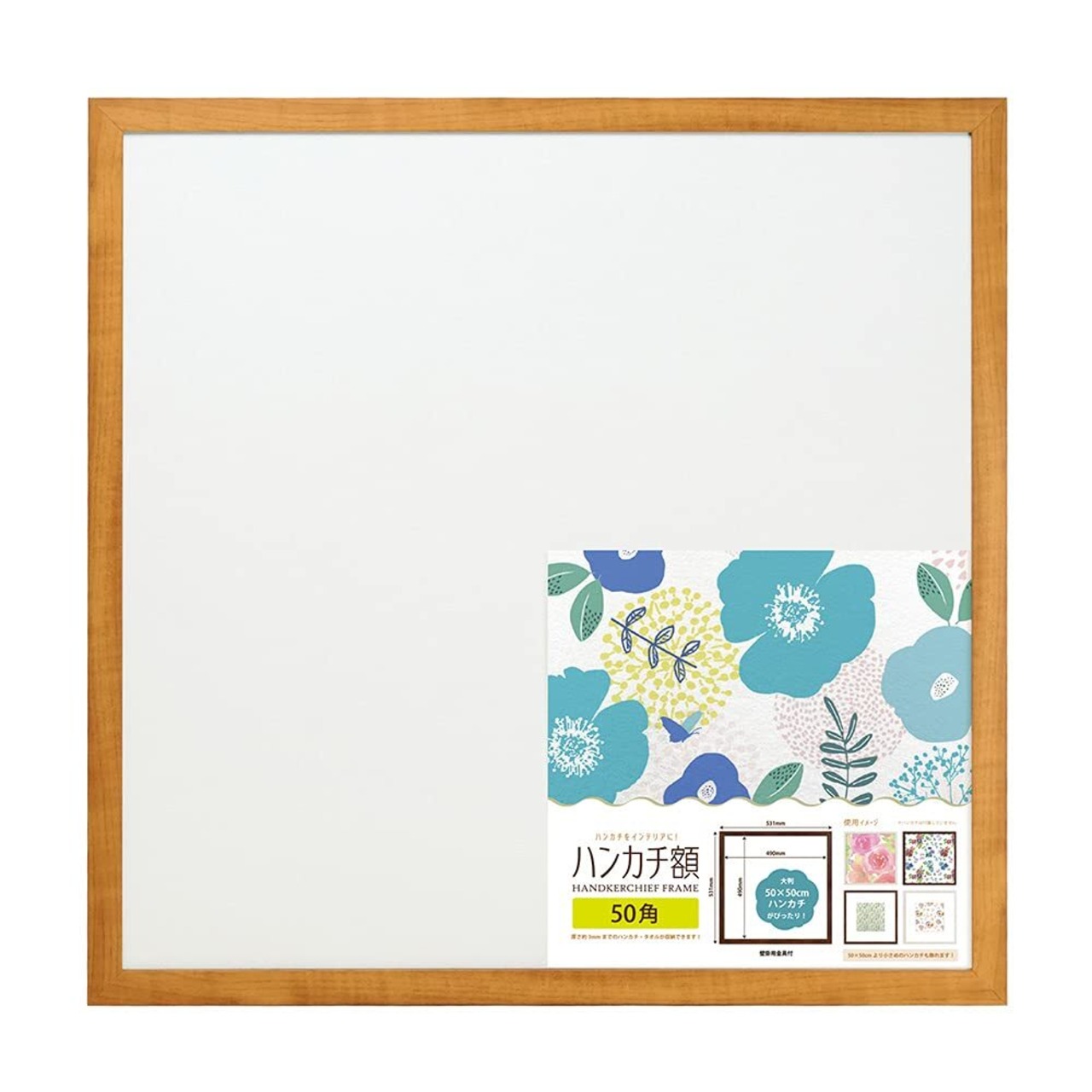 大判ハンカチやスカーフなどを大きく飾れる50角サイズのフレームです。