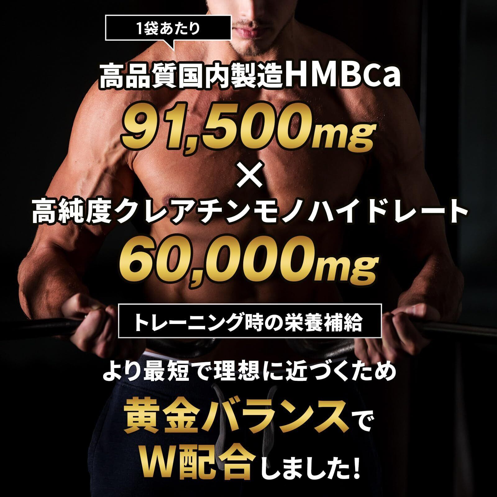 【業界最大級151,500mg】" トレーニング時 "や" 引き締めダイエット時 "の栄養補給に欠かせないHMBを91,500mg、高純度クレアチンモノハイドレートを60,000mgの黄金バランスで配合。