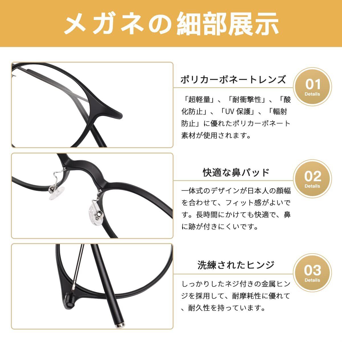 【丸いファッション眼鏡】フェイスラインをスタイリッシュに、ファッション性に富んだラウンドデザインを採用しました。様々な顔の形・幅に合わせて優しくフィットして、小顔効果を持っています。また、軽やかでストレスのないことで人気があり、男女問わずご使用いただけます。