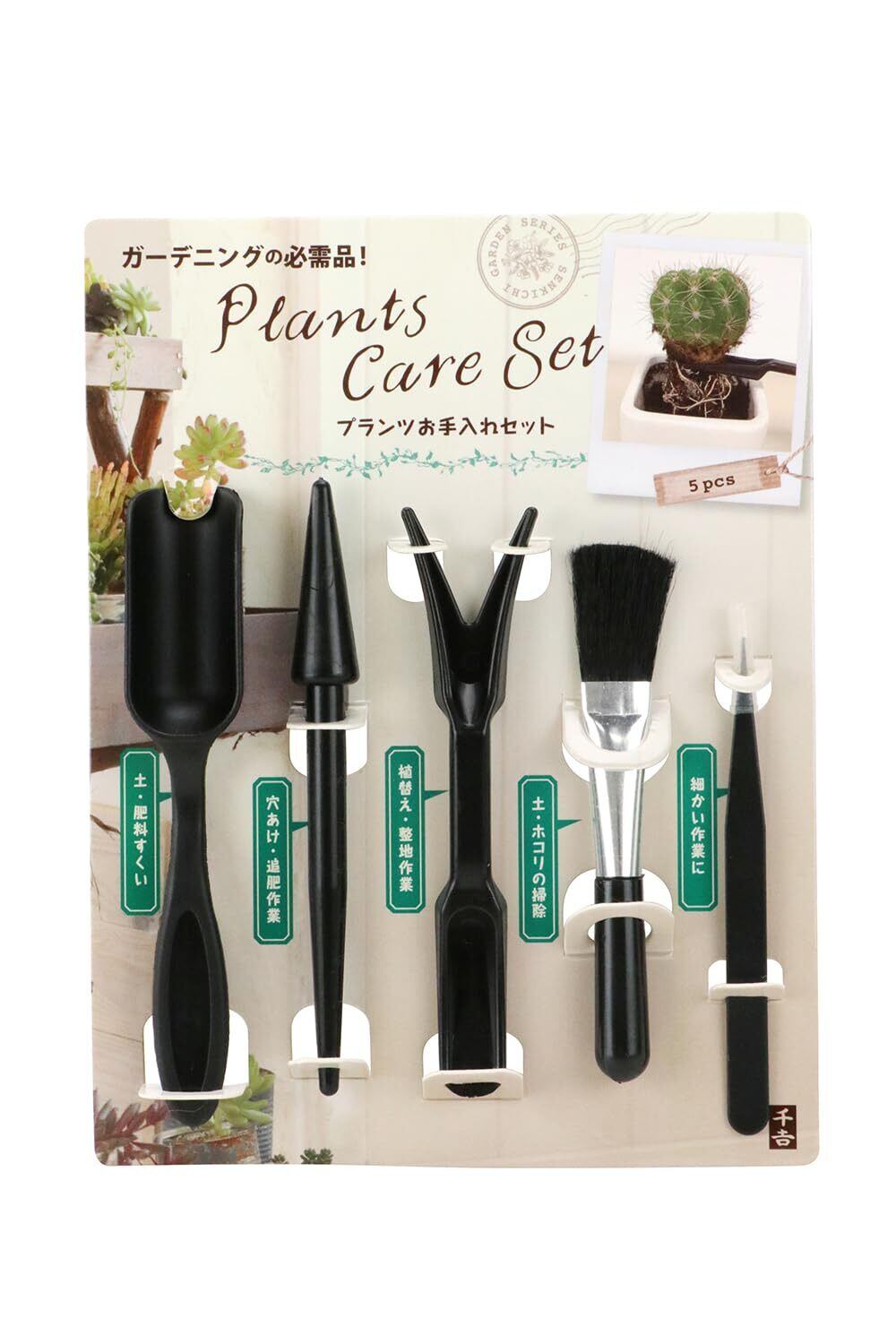 千吉 プランツお手入れセット 5pcs 多肉植物・観葉植物等のお手入れ 肥料・植物の入れ替え作業 セット内容:スコップ・穴掘り・苗リフター(植え替えツール)・クリーニングブラシ(ハケ)・ピンセット