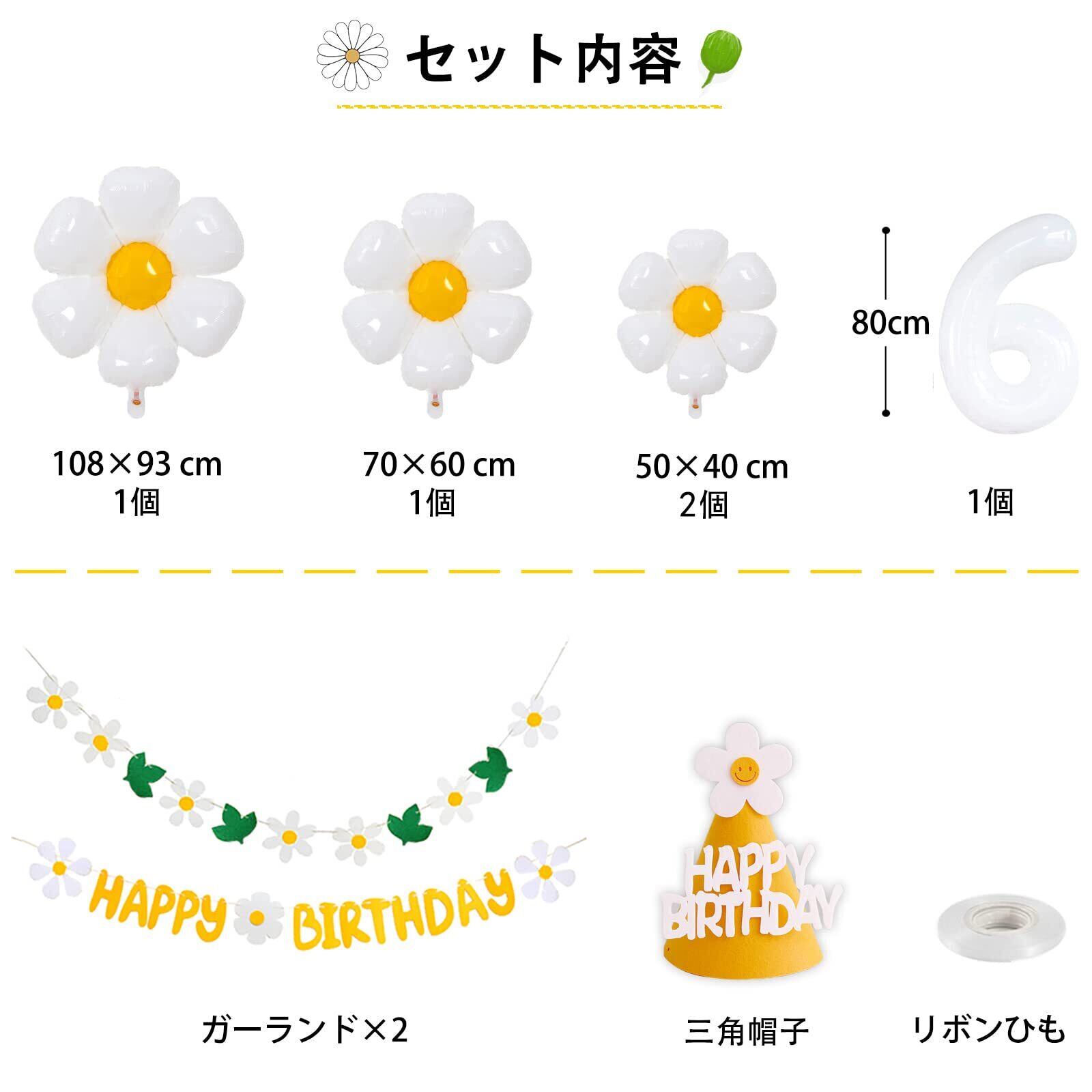 【セット内容】①フェルト布ガーランド×2 ②デイジーバルーン ×4 ③数字バルーン×1 ④三角帽子×1 ⑤リボンひも (10m)