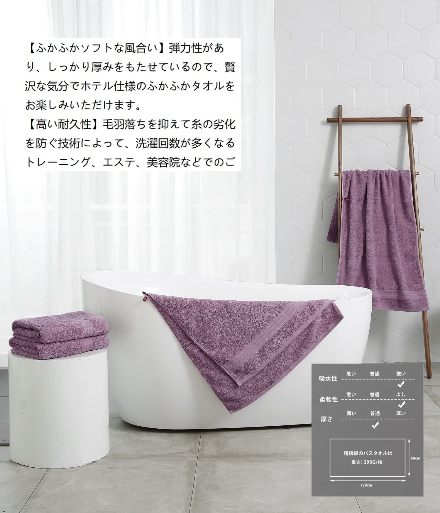 【高品質の綿バスタオル 4枚セット】サイズ:約60×120cm、重量:約290g ,このバスタオルは、綿糸の中でも最高級の「コーマ綿」繊維を使用しており、長繊維を丁寧に加工することで、柔らかくしっとりとした肌触りを実現しました。掉毛が少なく、長期的な使用にも耐えられます。洗濯しても毛羽立ちが少なく、清潔感を保ちやすく、長くお使いいただけます。