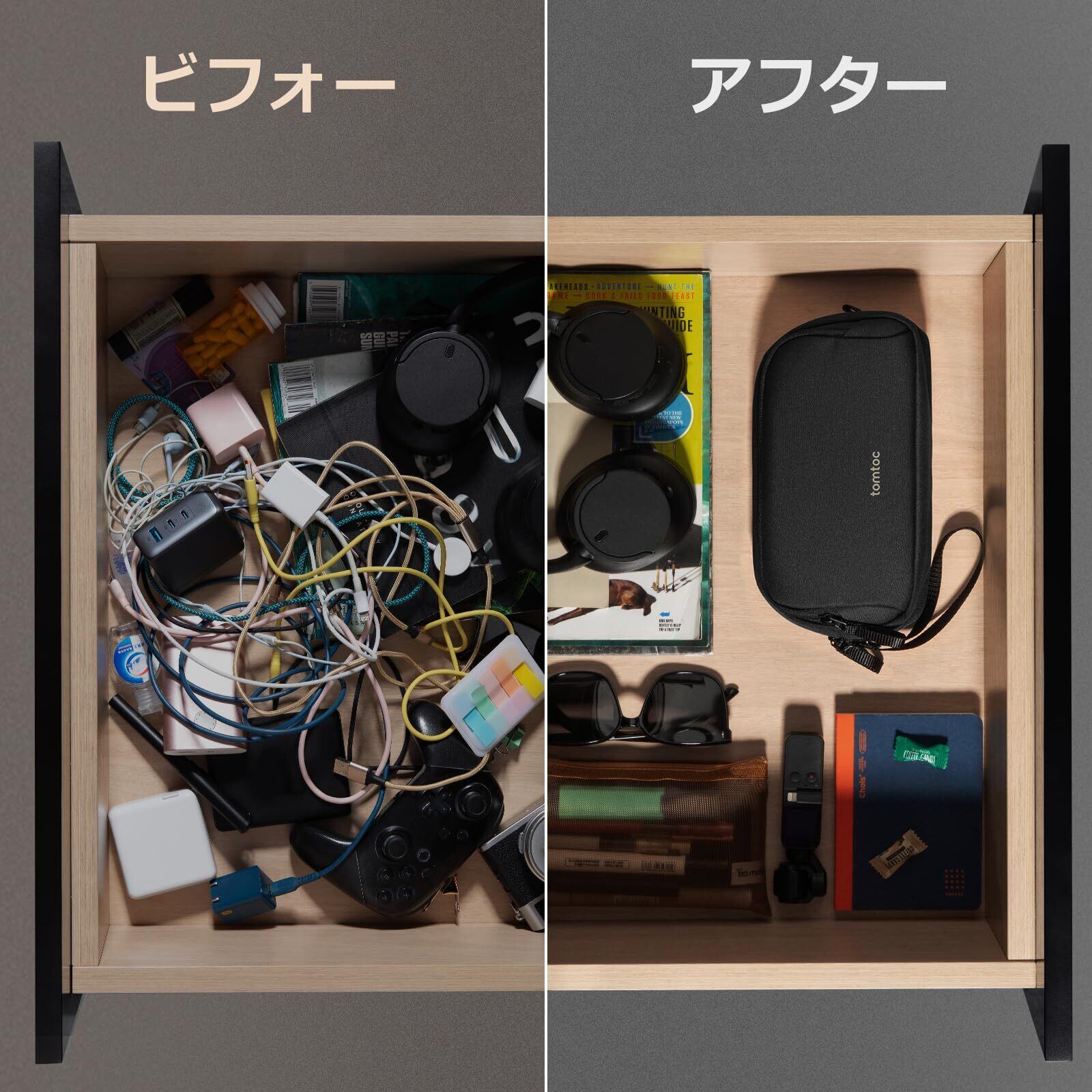 【持ち運びやすい便利グッズ】複数のバッグポケットにバラバラに収納された小物アイテムを探す邪魔を軽減させるために設計したこのガジェットケースは、リュックサック、トートバッグ、スーツケースの中に入れて持ち運ぶこともできます。自立できる洗練された仕様で、中身を見渡しやすく取り出しやすいのも魅力。