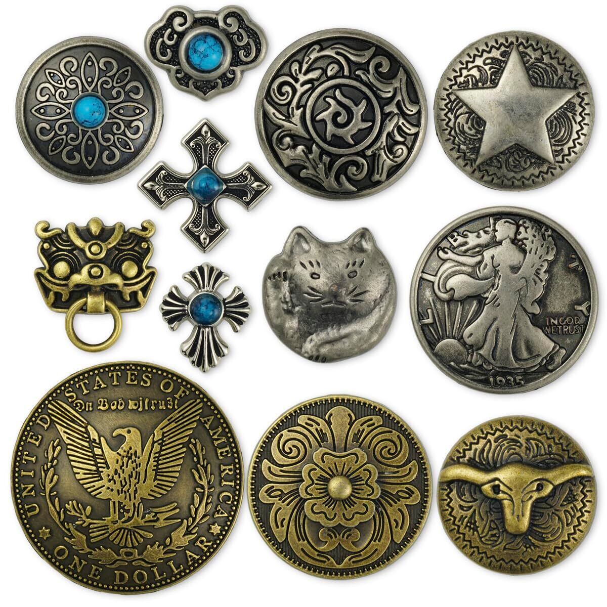 コンチョ ボタン 12個セット ねじ式 アンティーク シルバー 金古美 15mm~38mm ターコイズ 唐草 クロス フラワー レザークラフト 財布 手芸