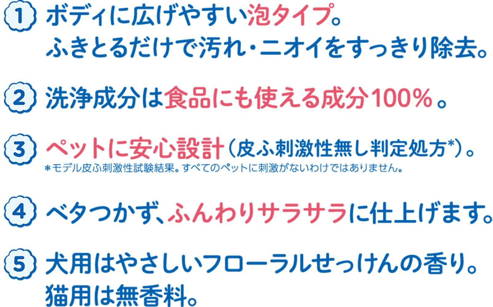 デリケートな愛猫の皮ふ・被毛をいたわりながら、汚れ・ニオイをすっきりふきとる。ベタつかず、ふんわりサラサラな仕上がり。洗浄成分は食品にも使える成分100%。ペットに安心設計(皮ふ刺激性なし判定処方*)。無香料。「ペットキレイネコペロブラシ猫用」(別売)との併用がおすすめ。 *モデル皮ふ刺激性試験結果(全てのペットに刺激がないわけではありません。)