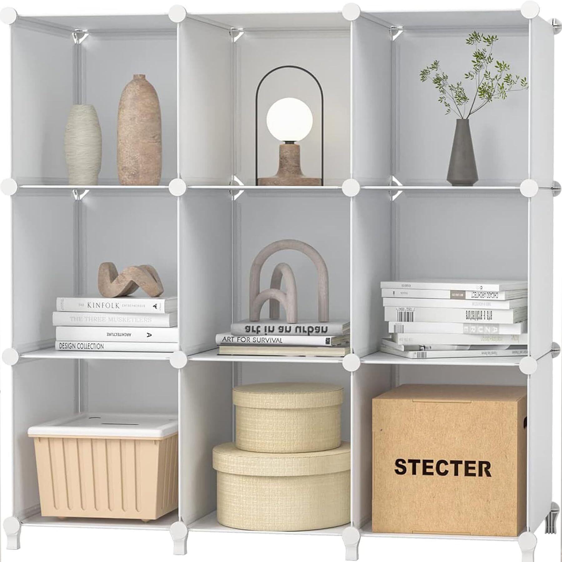 【大容量で収納もレイアウトもスマートに】 収納ボックス1個あたりサイズ:W30×D30×H30cm。棚板を支えるフレームは頑丈なスチール製収納棚で、1ラックあたりの耐荷重は3.5kg まで耐えられる。●棚板:環境に優しく、耐久性にも優れたポリプロビレン材質で、いつでもお使いいただける。●フレーム:頑丈なスチール製で、棚板をガッチリ支えてかなり安定感がある。●連結パーツ:高品質ABS樹脂製で、強度と耐衝撃性を両立。