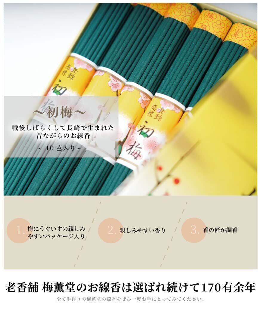 梅薫堂 初梅 小束10入 / 日本製 国産 淡路島 ばいくんどう 線香 お線香 御香 お香 家庭用 実用 仏壇 仏事 墓参 お墓参り お墓 喪中 葬儀 法事 法要 お盆 お彼岸 ご霊前 ご仏前 お悔やみ 初盆見舞い 初盆御見舞 ギフト 贈り物 贈答 香り 供養 遺族 伝統 はつうめ(普賢堂仕様)