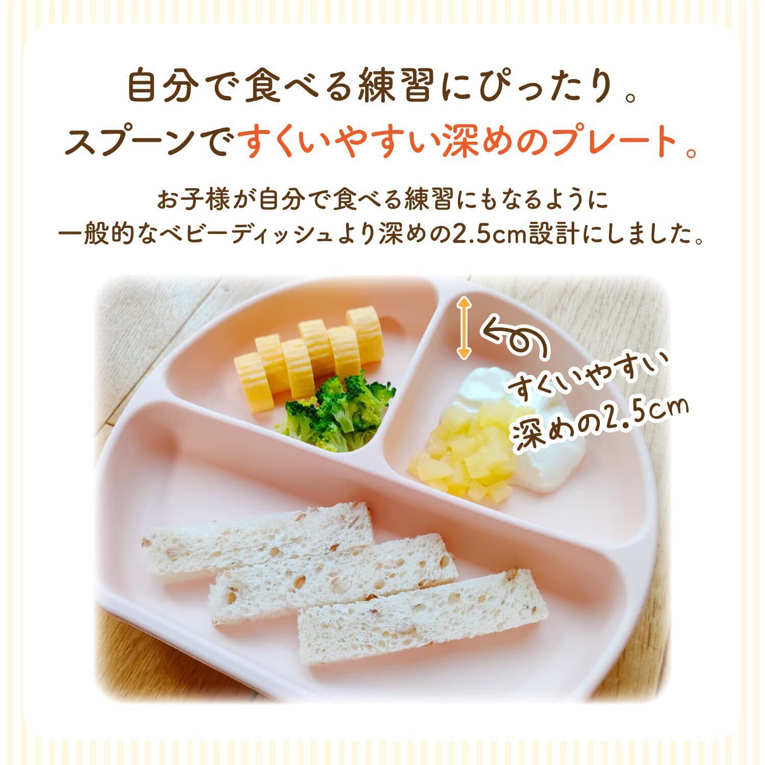【自分で食べる練習にぴったりの独自設計。】 スプーンですくいやすい深めのプレート。 お子様が自分で食べる練習にもなるように一般的なベビーディッシュより深めの3.5cm設計にしました。 また、プレートは手前が直線にカットされたデザインなので体に引き寄せて食べこぼしを最小限にします。