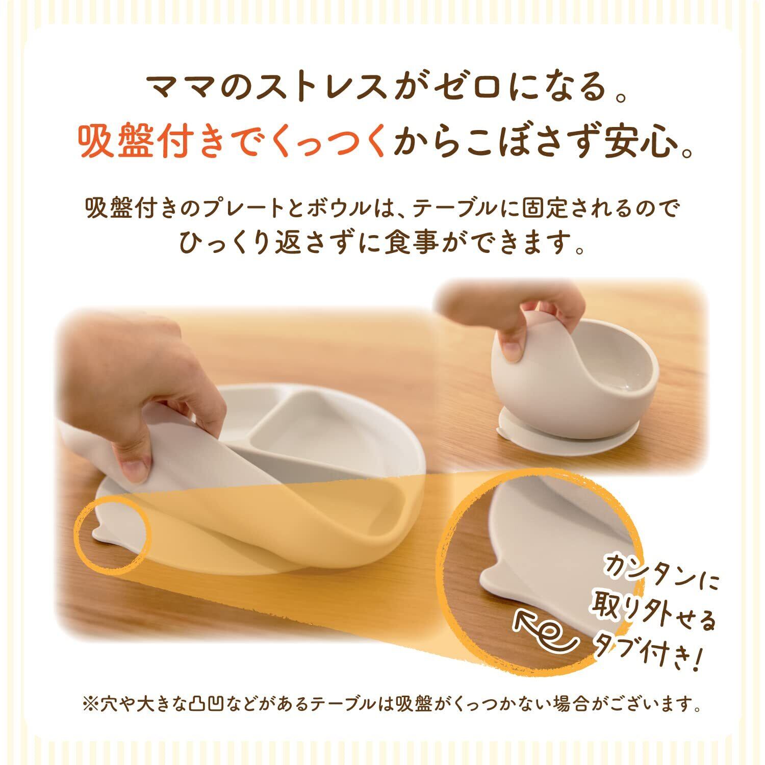 【吸盤付きでくっつくからこぼさず安心。】 吸盤付きのプレートとボウルは、テーブルに固定されるのでひっくり返さずに食事ができます。