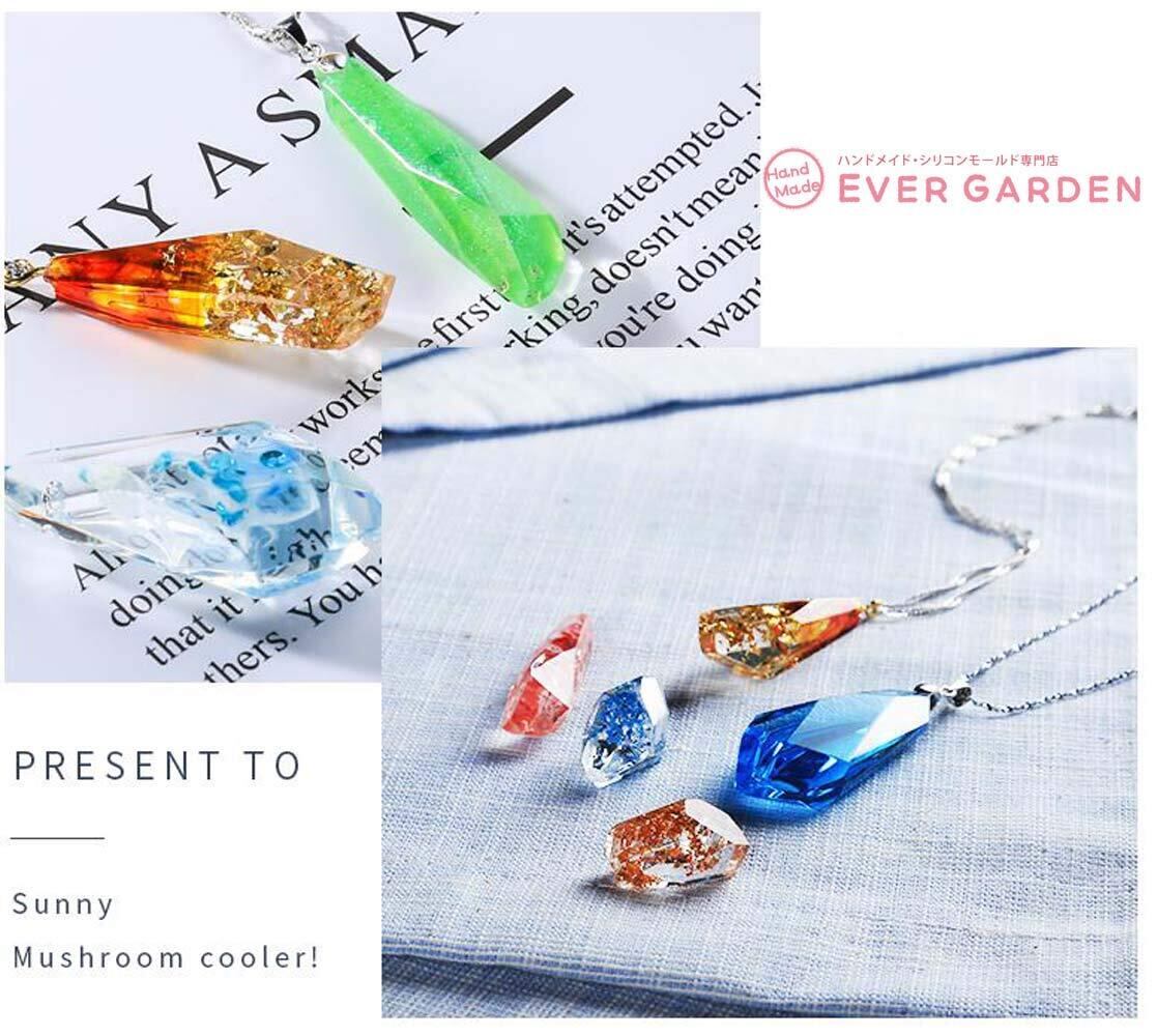 【商品について】 シリコン製の宝石型(鉱石モールド)のモールド4点セットです。UVレジン、エポキシ樹脂、樹脂粘土などに ご利用いただけるシリコンモールドです。 イヤリングやネックレス、ペンダントなどのオリジナルの作品を制作することができます。こちらのモールドは透明度の高い、品質よい素材を使用しております。仕上がりを確認しながら作業ができ、UVレジンでもライトを通しやすく硬化しやすいです。ソフトタイプなので、完成品を型から外しやすくなっております。やわらかくて鏡面仕上げ(鏡面とは出来上がりが曇らず、磨く作業が不要)なのでツルツルの作品が作れます。