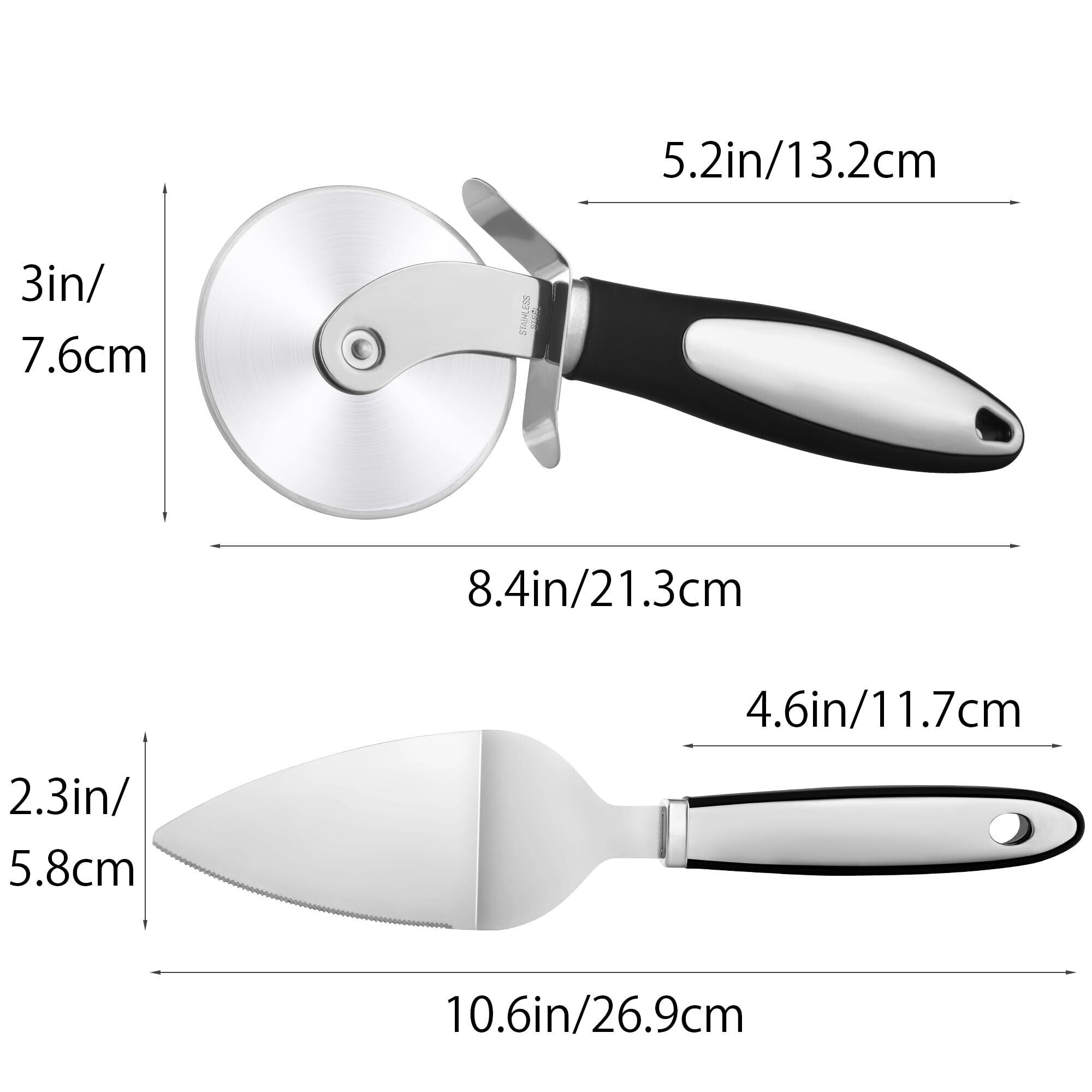 【商品仕様】ピザカッター:直径×全長:21.3CM×7.6CM、重量:105g。ピザサーバー:26.9cm×5.8cm、重量:100g。
