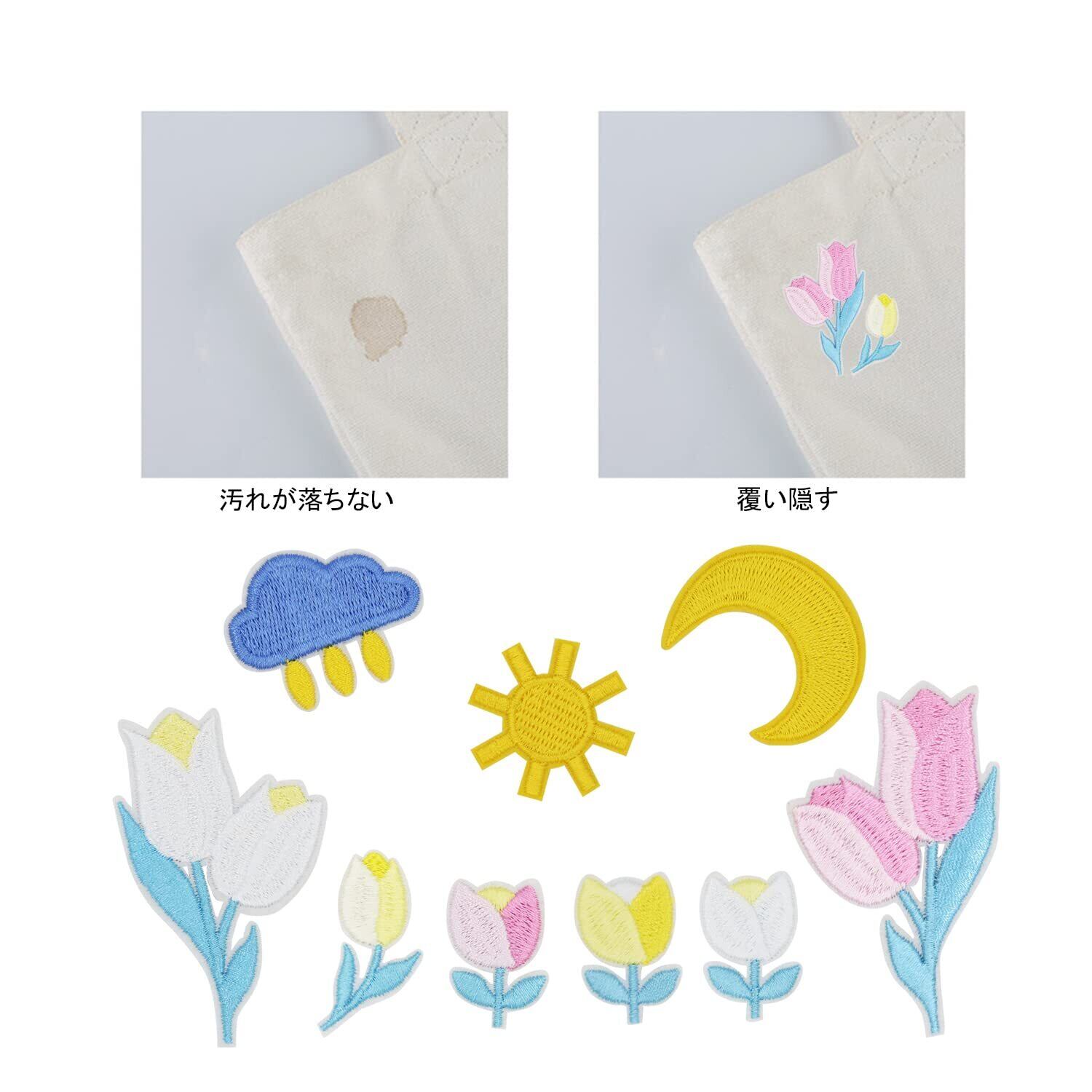 ワッペン アイロン刺繍 アップリケ DIY服 チューリップ 花 花 月 日 曇 モチーフ カワイイ 装飾 男の子 女の子 保育園 幼稚園 パッチ 補修 大きめサイズ 9枚セット 衣類 浴衣 手袋 手帳 飾り