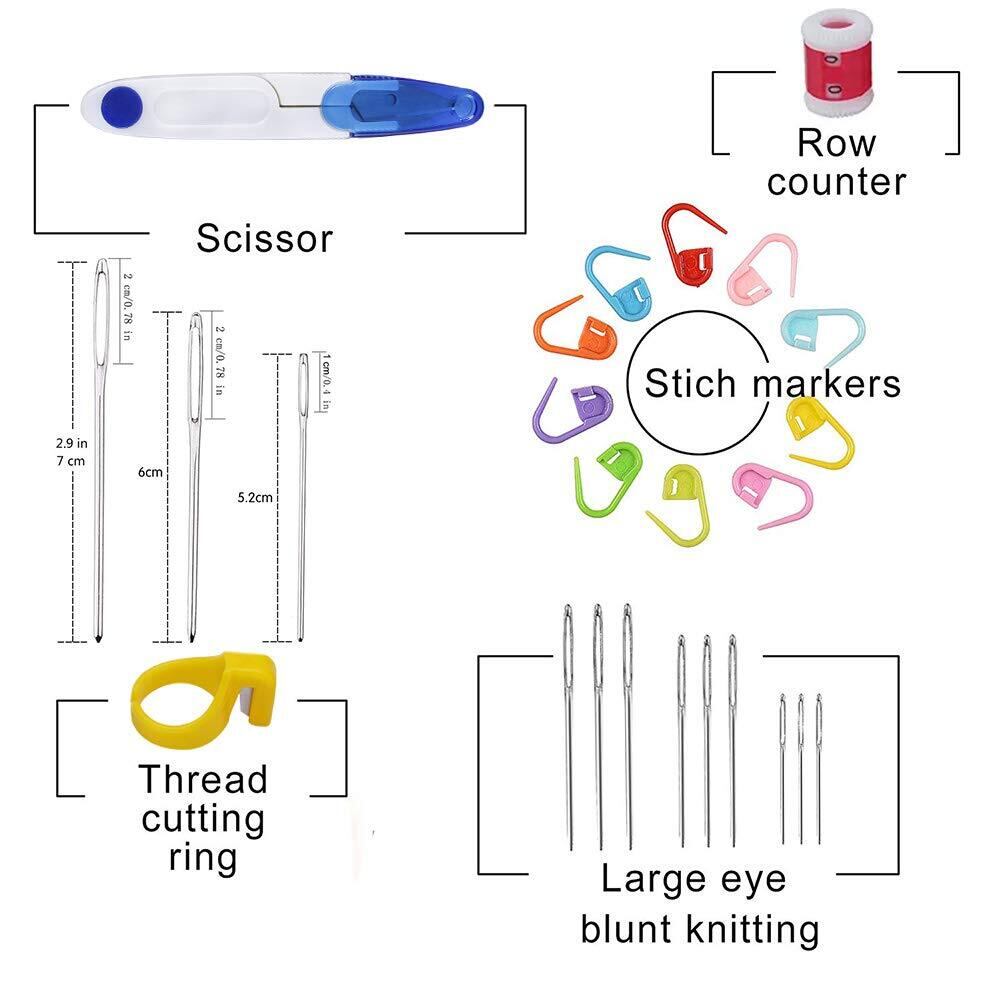 小物付き: 二種類の手縫い針がついています。針孔が大きいため、毛足の長い毛糸や超極太毛糸でもスムーズに通すことができる。編み目をすくいやすいように針先が少し曲がった形状がポイント。また、増減目の位置に段数リングをつけると、 編みながら確認できスムーズに編み進められます。