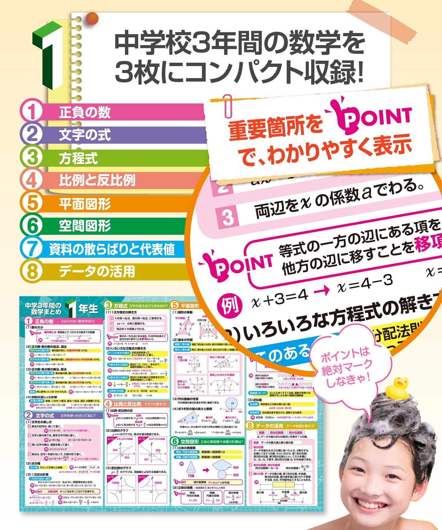 耐水性素材でお風呂でも使用可能:ポスターは耐水性の「ユポ紙」を使用しており、水だけで簡単に貼り付けることができます。これにより、お風呂場でも学習が可能で、バスタイムを有効活用して中学数学の習得ができます。耐久性が高く、長期間使用しても劣化しにくいです。