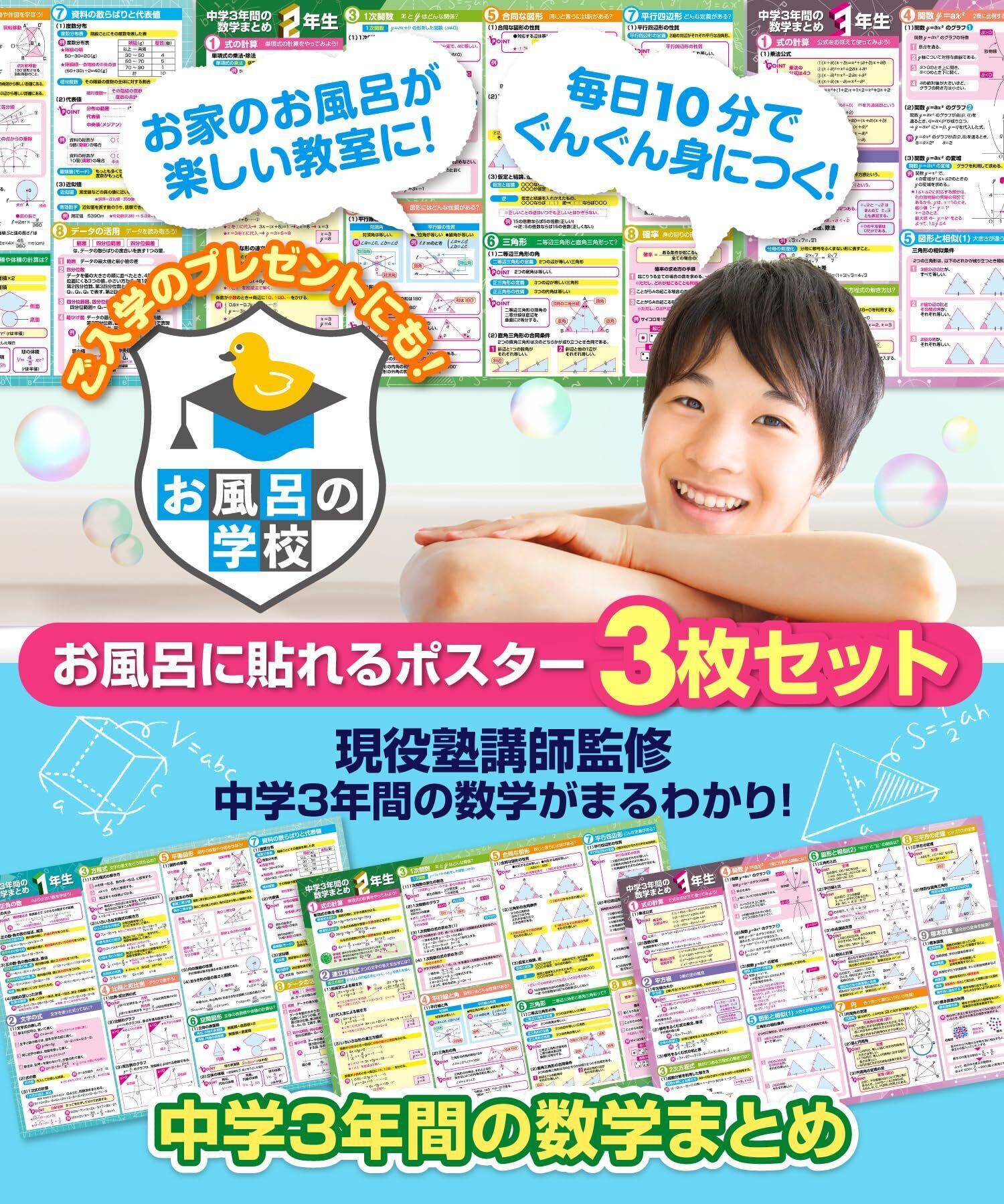 お風呂の学校 中学3年間の数学まとめ お風呂ポスター 3枚セット 日本製 高校受験 B3サイズ(横51.5cm×縦36.4cm)学習 防水