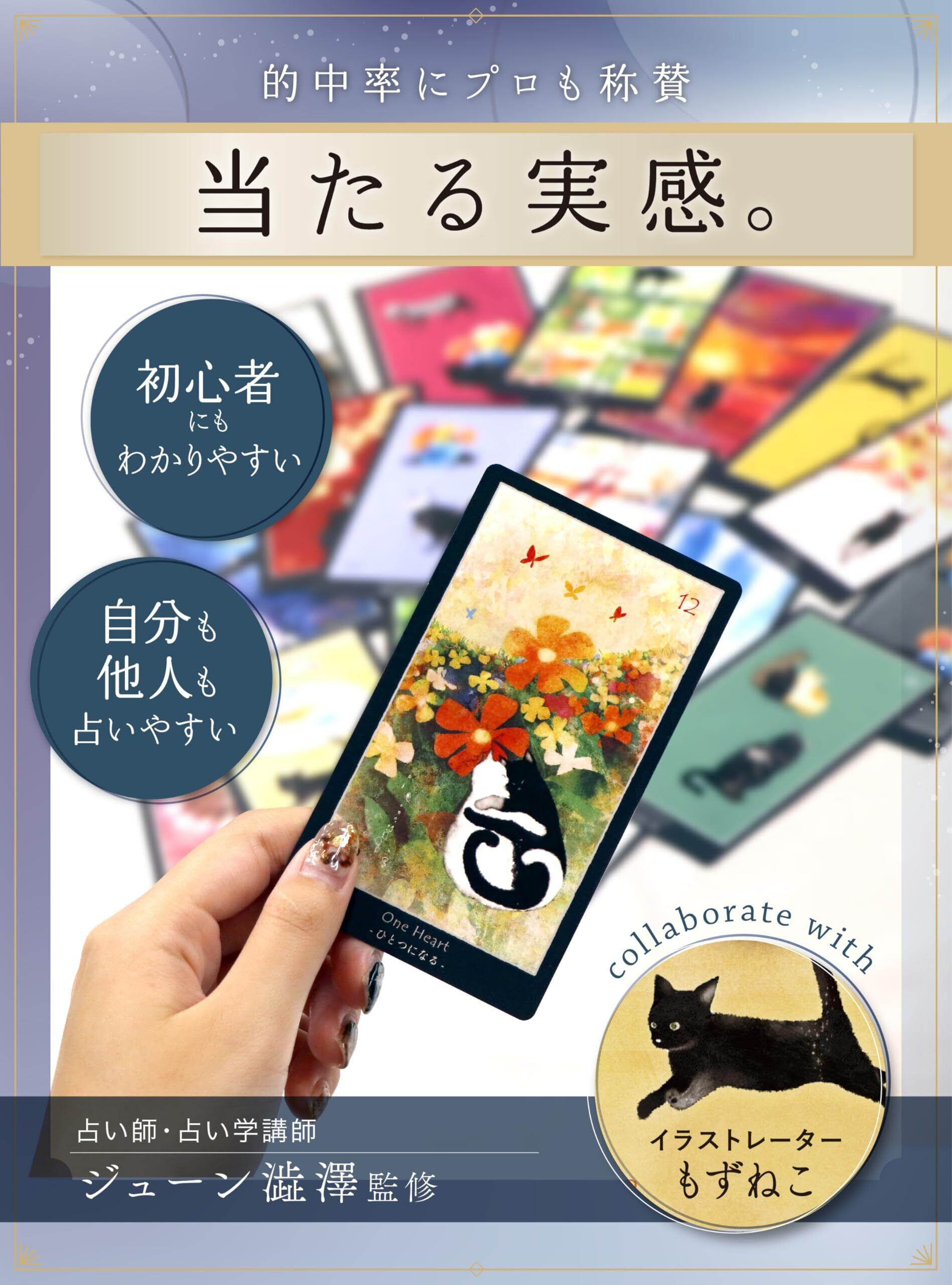 【ジューン澁澤監修】“幸運の使い”である黒猫をモチーフにした、ジューン澁澤氏考案の日本製オリジナルタロットカードです。占う人の潜在意識や状況を映し出す「黒猫」と「背景」の組み合わせによって、あなたやお相手の感情・状況・取るべき対策が、細やかに示されます。