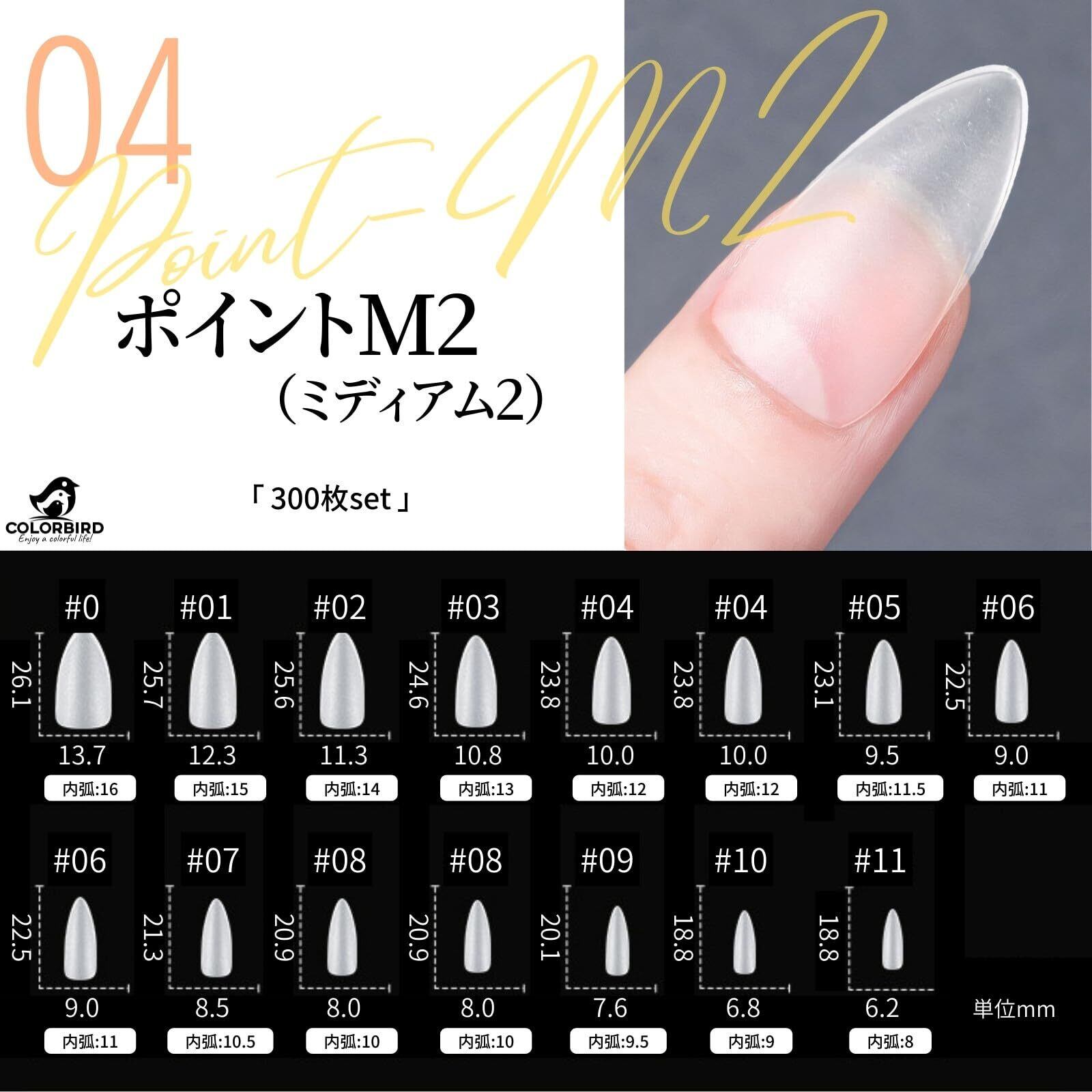 COLORBIRD ネイルチップ 超薄 ショート クリア サンディング 自然なフィット感 つけ爪 (ポイントM2 300pcs)