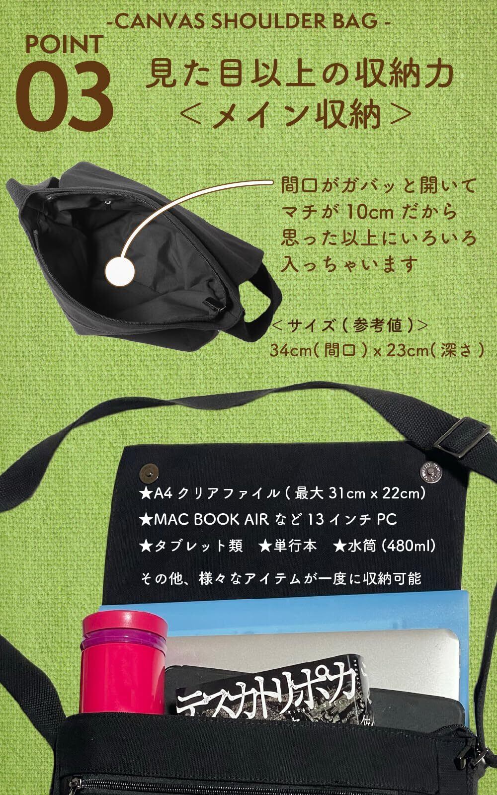 【見た目以上の収納】タブレット・13インチPC・A4書類・500mlペットボトル他、収納可能。(PC用の保護パッドはございません)マチが10cmなので、ラフに色々入るショルダーバッグ。メンズに限らず、女性にも使い易い肩掛けバッグです
