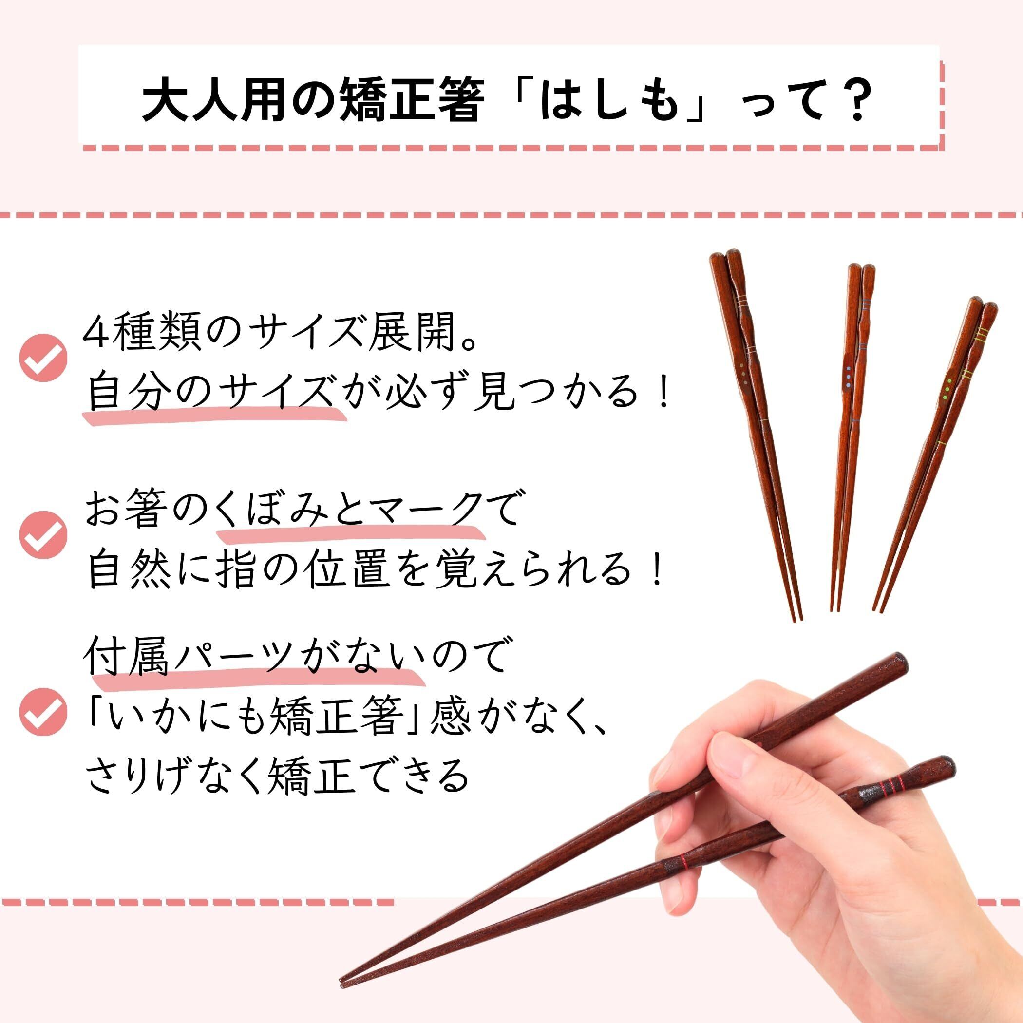 仕様 品名:はしも(大人用矯正箸、三点支持箸) 材質:天然木 塗装:うるし塗装 産地:日本 サイズ:右利き用 23.5cm, 23cm, 20.5cm, 18cm / 左利き用 23cm, 20.5cm, 18cm 内容:箸1膳 お手入れ:手洗い 注意事項:右利きと左利きの箸があります。適切なものを選んでください。 「はしも」矯正箸は、美しい箸使いを身につけたい大人の女性にぴったりのアイテムです。日本製で品質にこだわり、使い勝手と美しさを兼ね備えたこの箸は、毎日の食卓をより豊かなものにしてくれるでしょう。