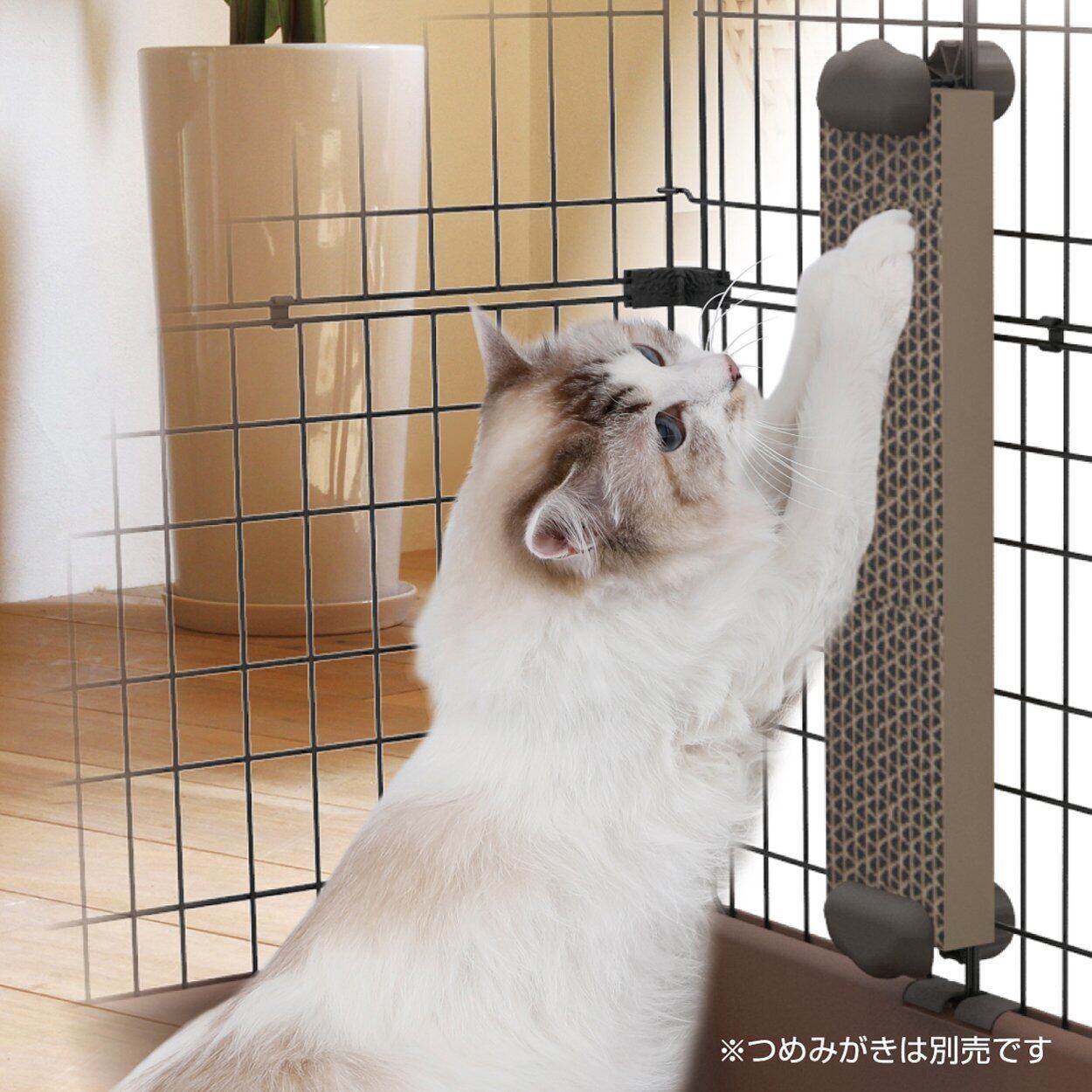 [取付け方法]※しめ過ぎによる破損や、取付け時のケガには十分に気をつけてください。※つめみがき・つめとぎは、ケースから出して取付けてください。つめみがきホルダーからキャップを取外し、つめみがき(別売)の上下とフェンスをしっかりと挟み、固定してください。猫がツメをとぎやすい高さに設置してください。注意:事故やケガの原因となりますのでネジが飛び出た状態では絶対に使用しないでください。パーツの向きに注意して取付けてください。(厚さ20〜40mmのつめみがきに対応)※キャットサークル・ケージの縦線幅35mmまでに対応しています。