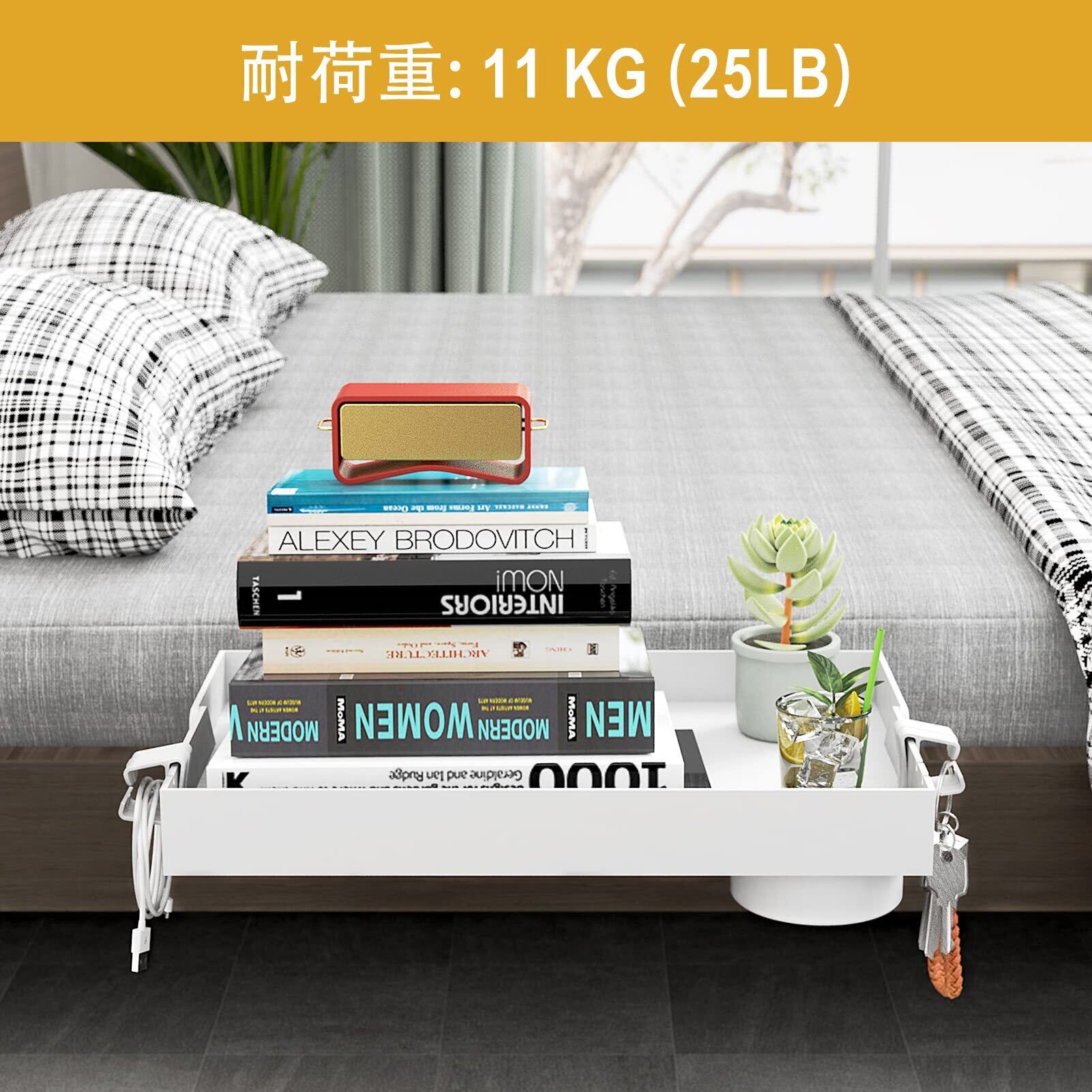 【調整可能】 サイズ:約38.99*24.5*8.5cm。クランプは調整可能で、ベッドサイドトレイがはまるベッドフレーム側のレールの最大幅は4cm(1.5インチ)で、ほとんどのベッドに適しています。
