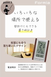 機能:電波受信機能 (自動受信/手動受信)、電子音アラーム、スヌーズ機能、六曜表示、温度表示、湿度表示、カレンダー表示、12/24時間制表示切替、表示切替機能 (日にちと時刻の表示位置が切り替わります)、置き掛け兼用