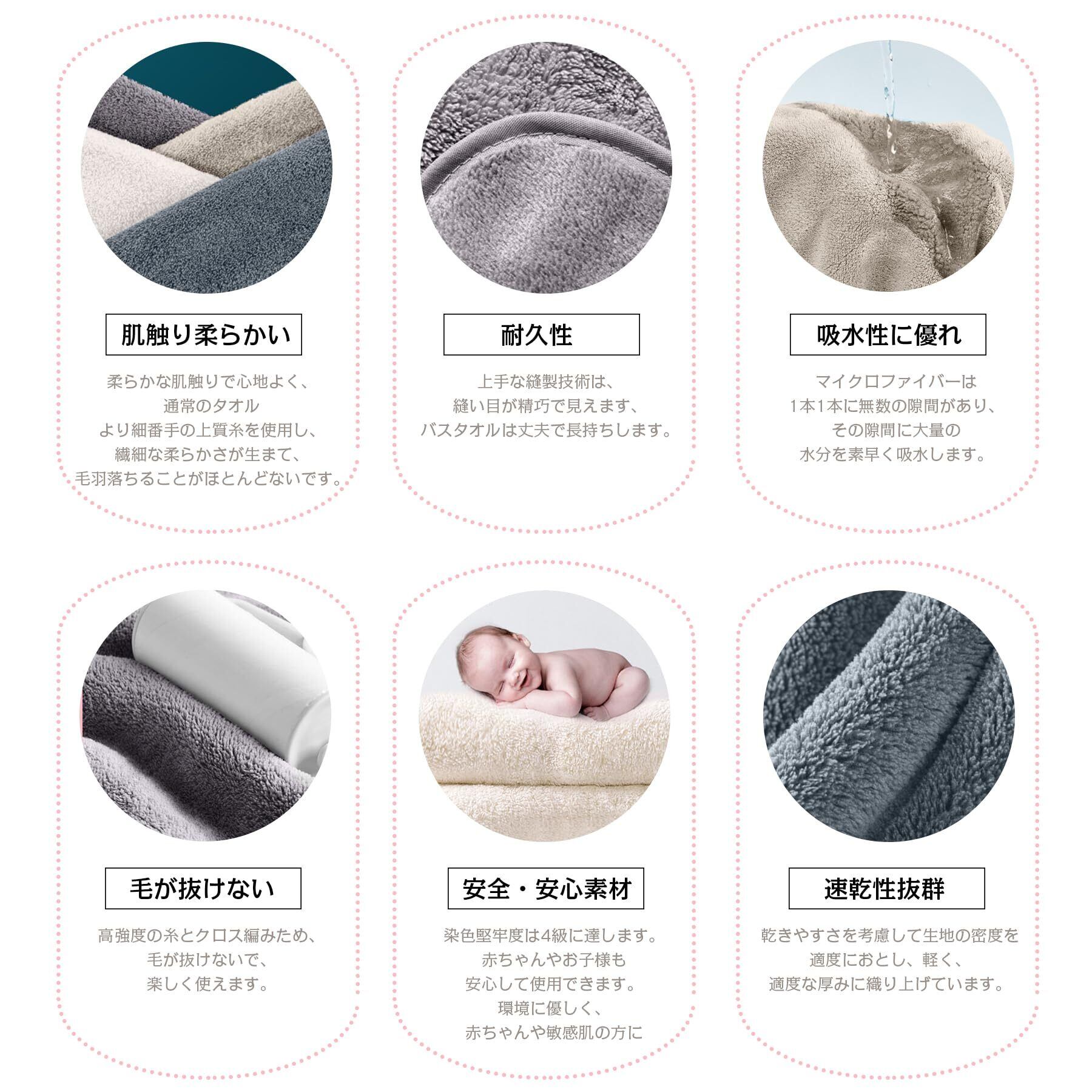 【抜群の吸水性と速乾性】綿の素材より吸水性が優れます。マイクロファイバーは1本1本に無数の隙間があり、その隙間に大量の水分を素早く吸水します。吸水力は普通のタオルより何倍もあり、抜群で瞬間吸水します。通気性は優れて、乾き早いの特徴は注目されるポイントです。梅雨の場合や湿気が多い季節でも、乾き早くていつも清潔を保ちます。洗濯物を乾きにくい時期にも快適で使えます。室内で干しても大丈夫です。