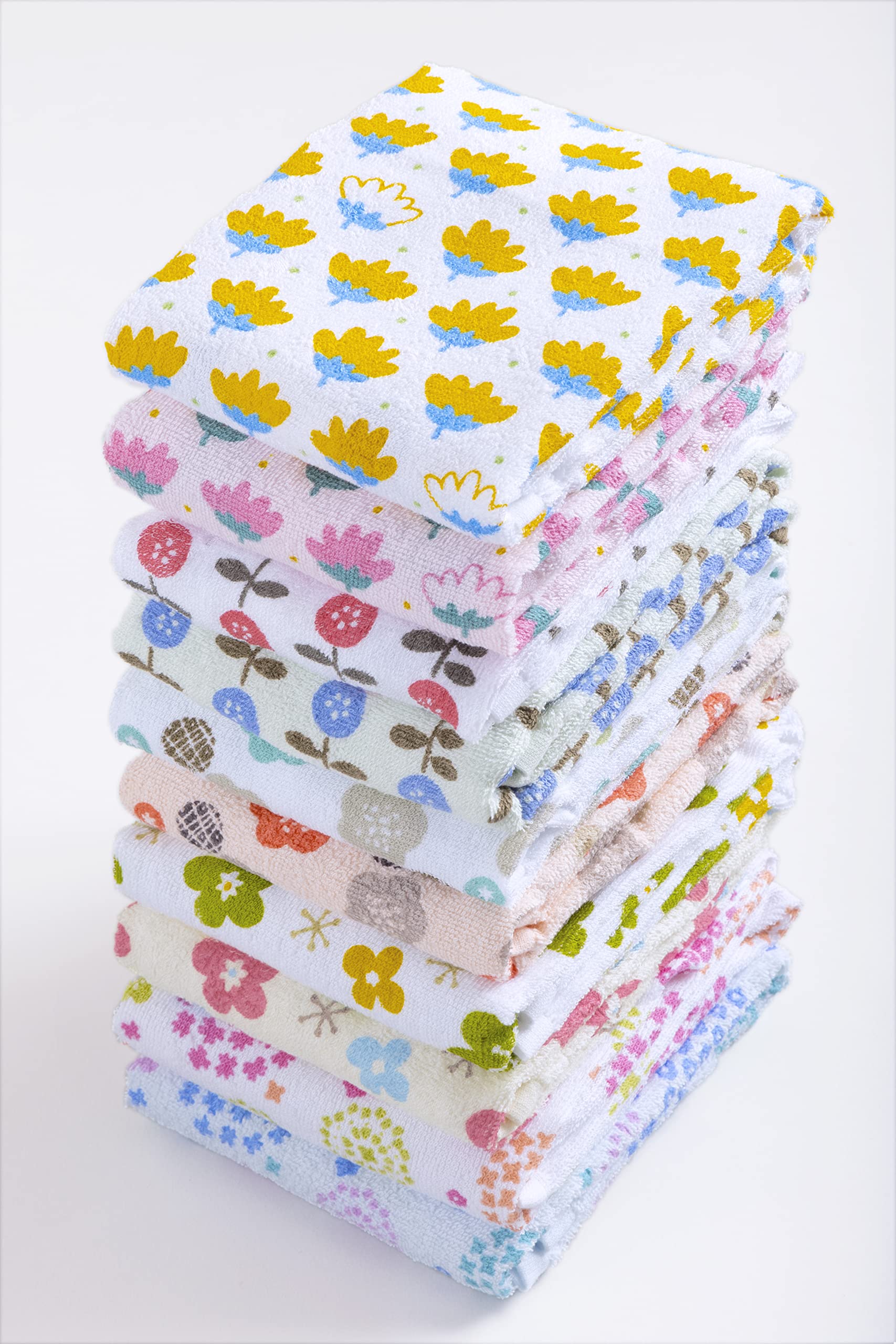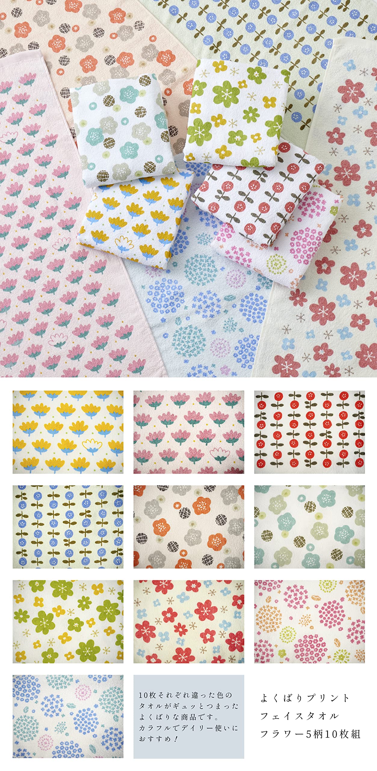 Kosugizen フェイスタオル よくばりプリントタオル フラワー 5柄2色×1枚入 34×80㎝ 乾きやすい薄手タイプ まとめてお得 10枚セット SV-2011-10