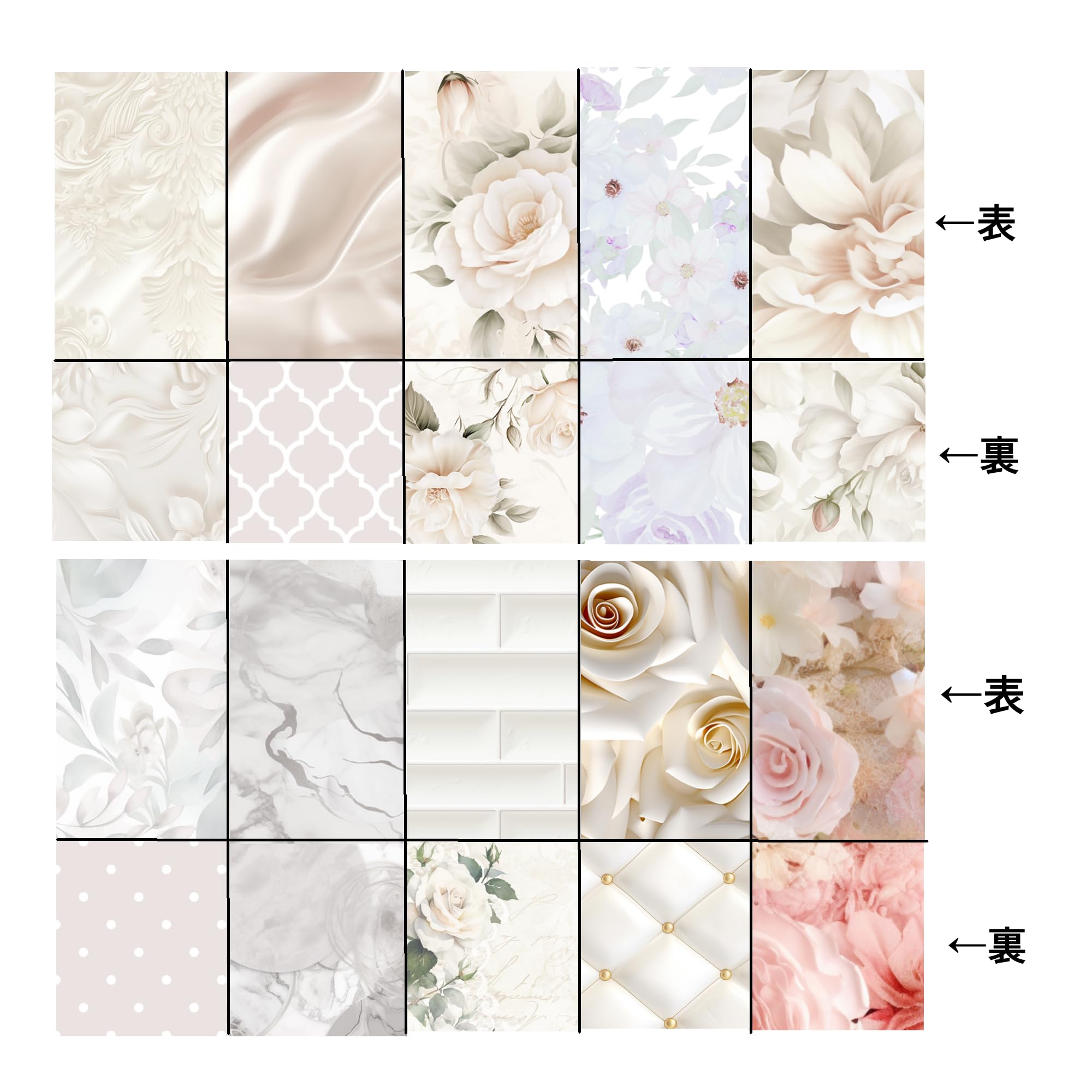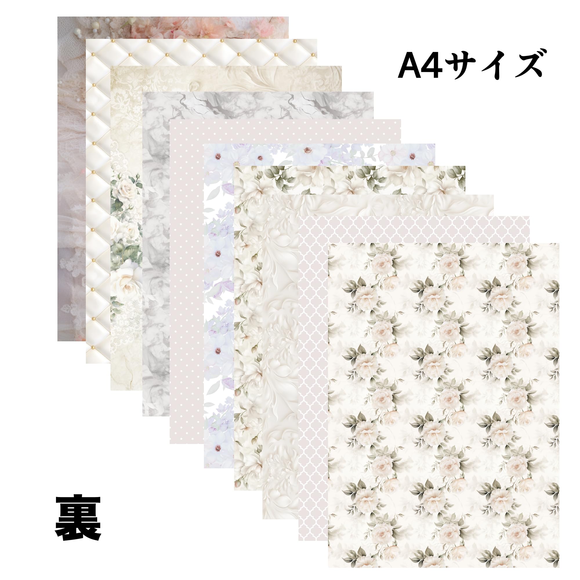 A4サイズのオリジナルデザインペーパー です。両面印刷。ホワイト系のウエディング関係にも使えるエレガントな柄のセット。両面お好きな柄をお使いください。 コピー用紙よりも厚め0.12mmの上質紙90kgを使用。 包装紙、コラージュ素材、ブックカバー、台紙、工作、POP、表紙、などなど使い道自由です。 ※パソコン上の色味と現実の色味は異なる見え方がある場合がございます。