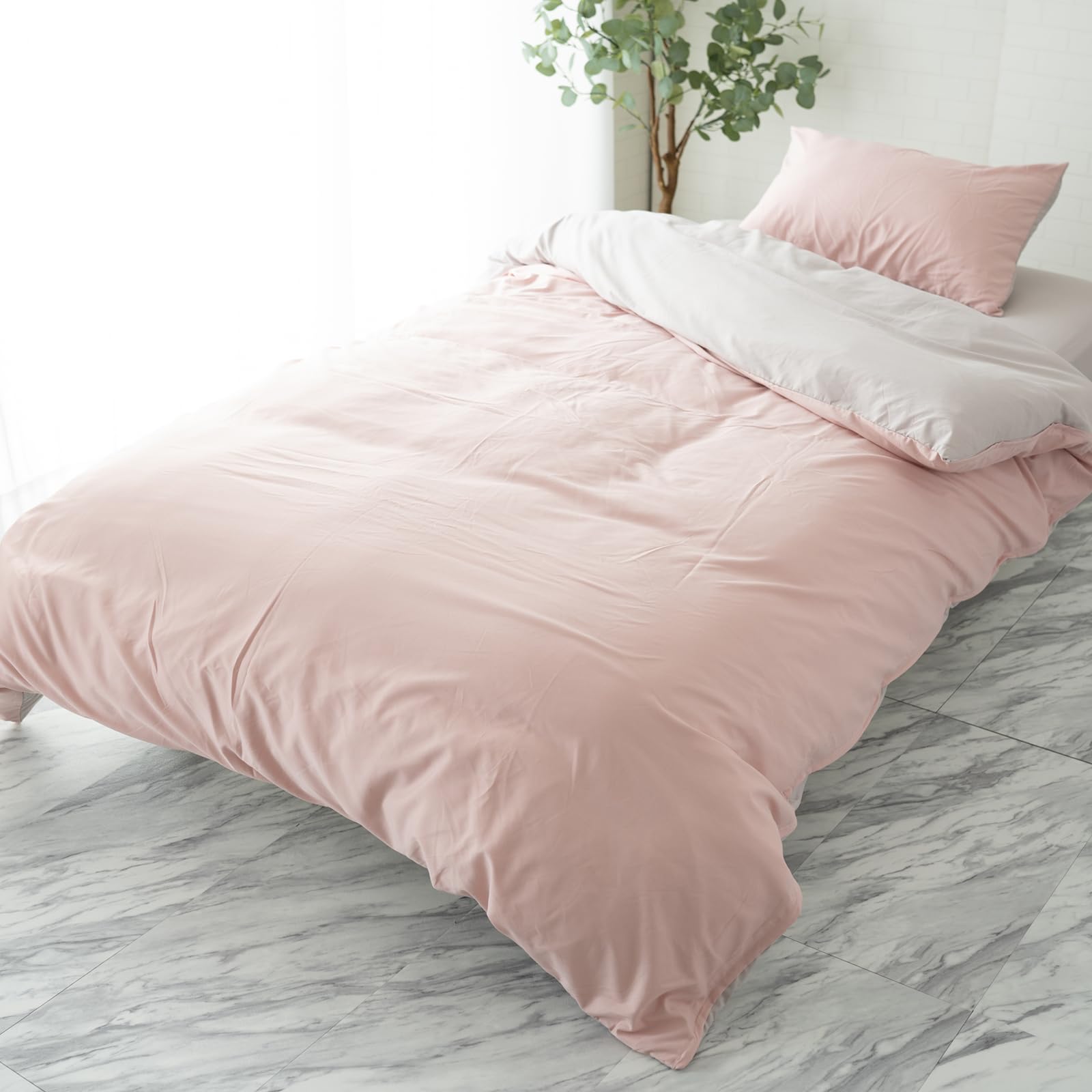 【商品仕様】カラー:ピンク グレージュ のツートンカラー 組成:ポリエステル100% ピーチスキン加工 サイズ:掛けカバー 150×210cm BOXシーツ 100×200×25cm(20cmまでのマットレスに対応しております) ピロケース 43×63cm (ファスナーを使わない封筒型です)