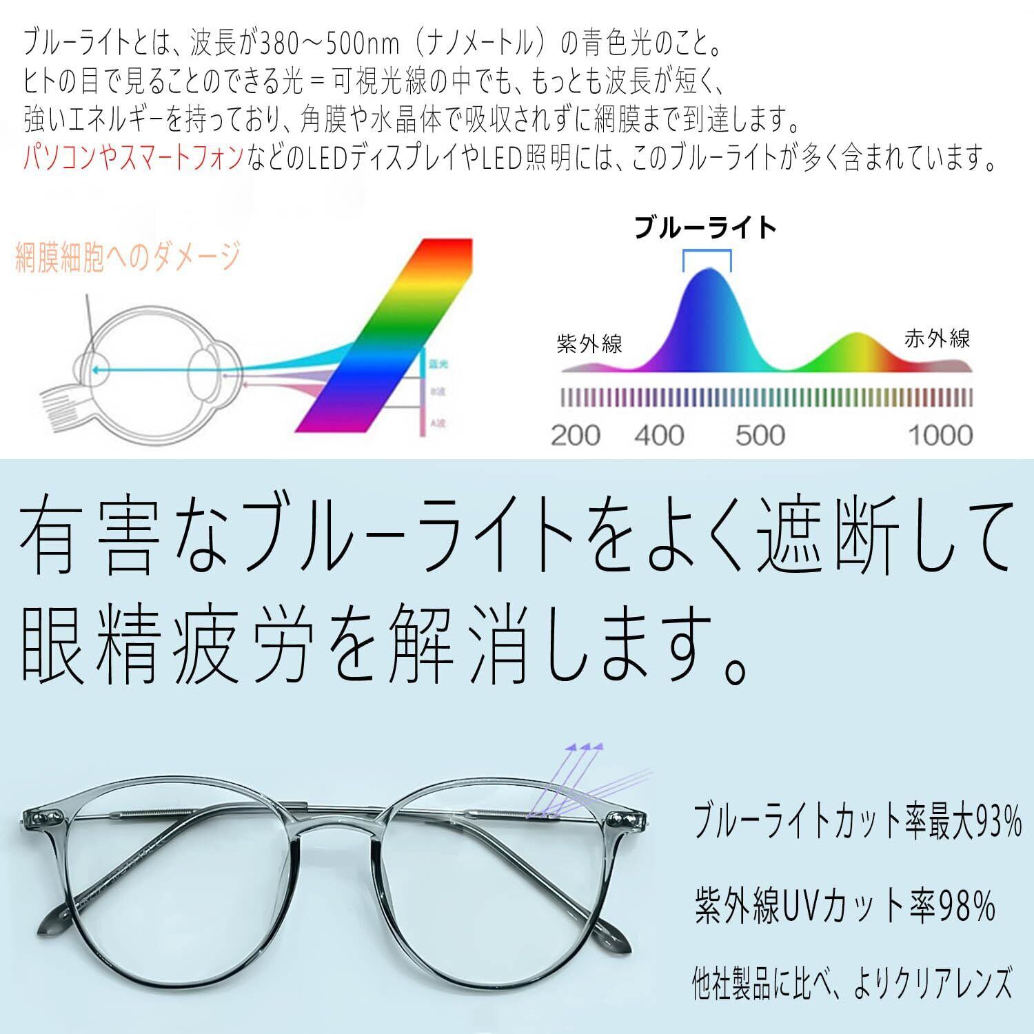 【こんな方におすすめです】 軽くて丈夫なものがほしい オシャレにこだわりたい 安くて性能がいい物がいい パソコンやスマホを見る回数が増えた どれを買えばいいかわからない ブルーライトをカットできているか自分で確認したい 伊達メガネとしても使いたい 流行りの丸メガネが欲しい