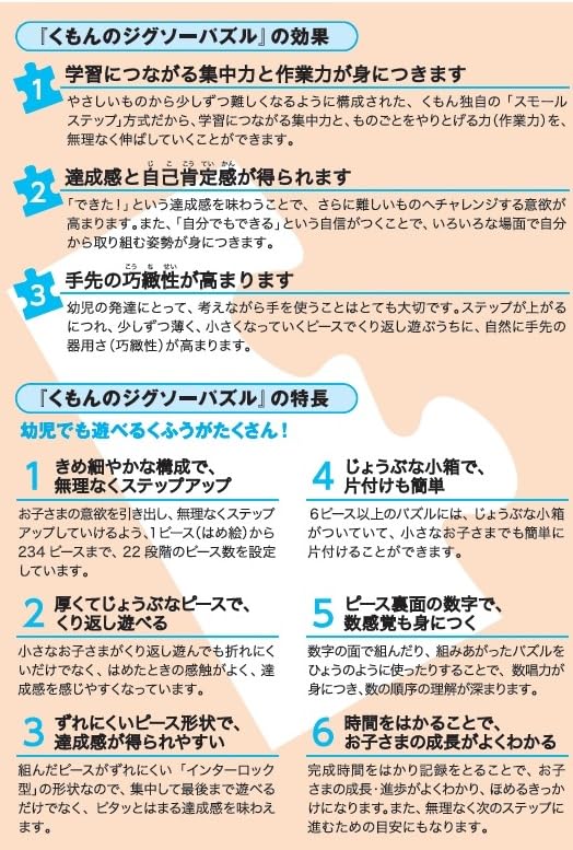 遊びながら学習につながる集中力と作業力を伸ばす「スモールステップ」方式のジグソーパズルです。ピースの少ないジグソーパズルから始めて、少しずつピース数を増やしていくことで、パズルを完成させる達成感を味わいながら、集中力と作業力を高めていけます。