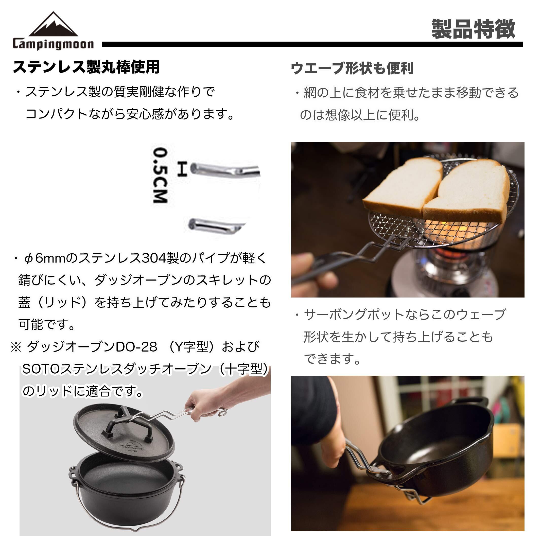 特徴:①ウエーブ形状である為、Y字型(ダッチオーブン DO-28)、十字型(SOTO ステンレスダッチオーブン)のリッドリフターとしても使用可能 ②コンパクトながらステンレス製の質実剛健な作り