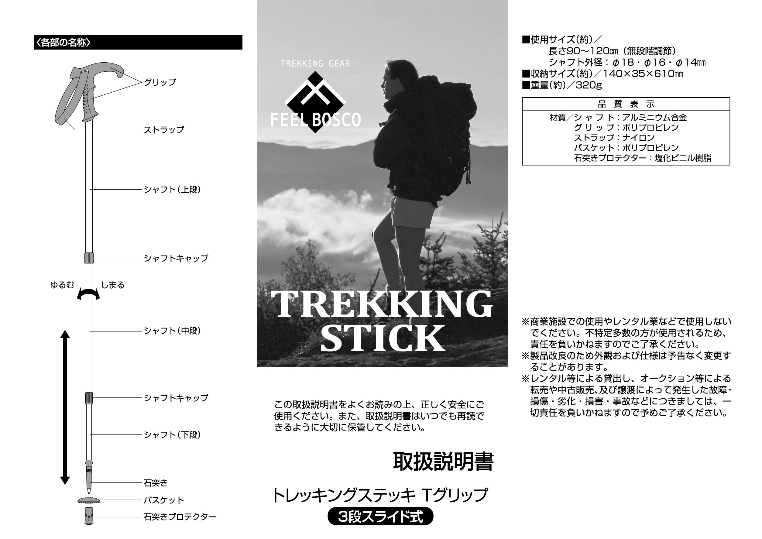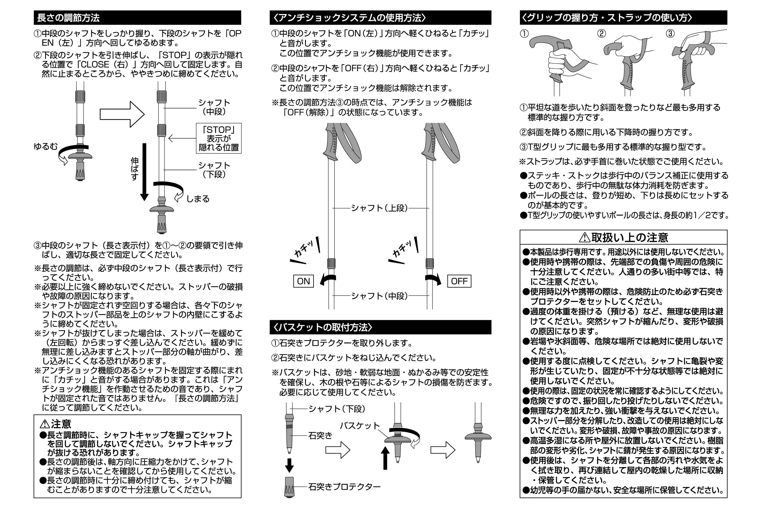 本製品はトレッキング専用です。用途以外には使用しないでください。特に介護用の杖としては、絶対に使用しないでください。長さの調節後は、軸方向に圧縮力をかけて、シャフトが縮まらないことを確認してから使用してください。使用時以外や携帯の際は、危険防止のため必ず石突きプロテクター(ゴムキャップ)をセットしてください。公共交通機関を利用して持ち運ぶ際はザックの中に収納する等誤って人にぶつけないよう取扱いにご注意ください。