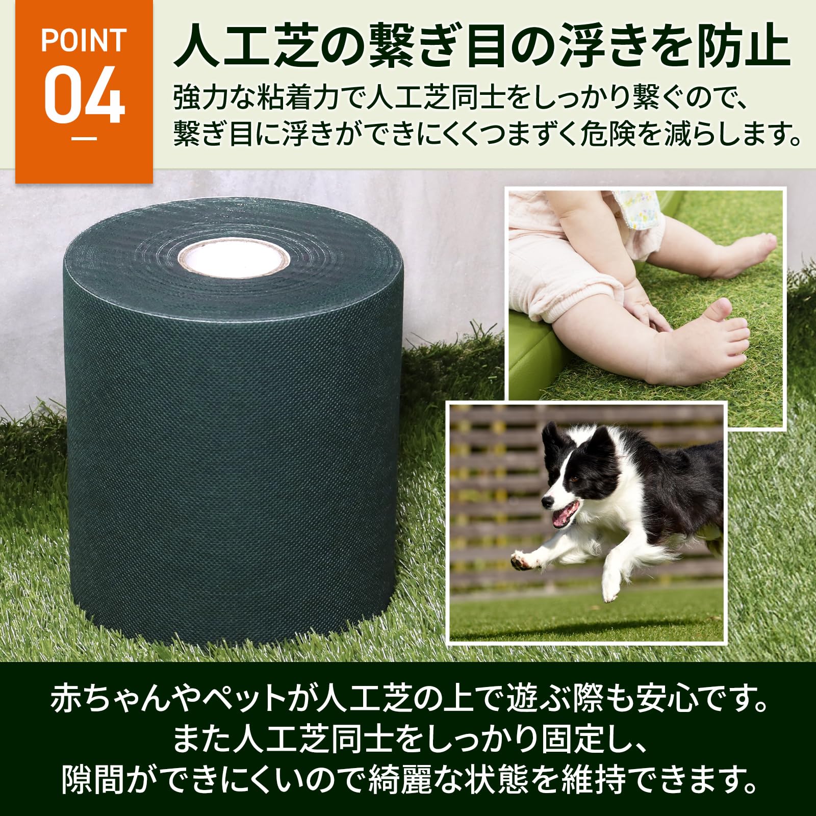 【 強力固定タイプ 】強力な粘着力で人工芝同士をジョイントします。施工後は人工芝同士に隙間が出来ずジョイント箇所も目立ちません。